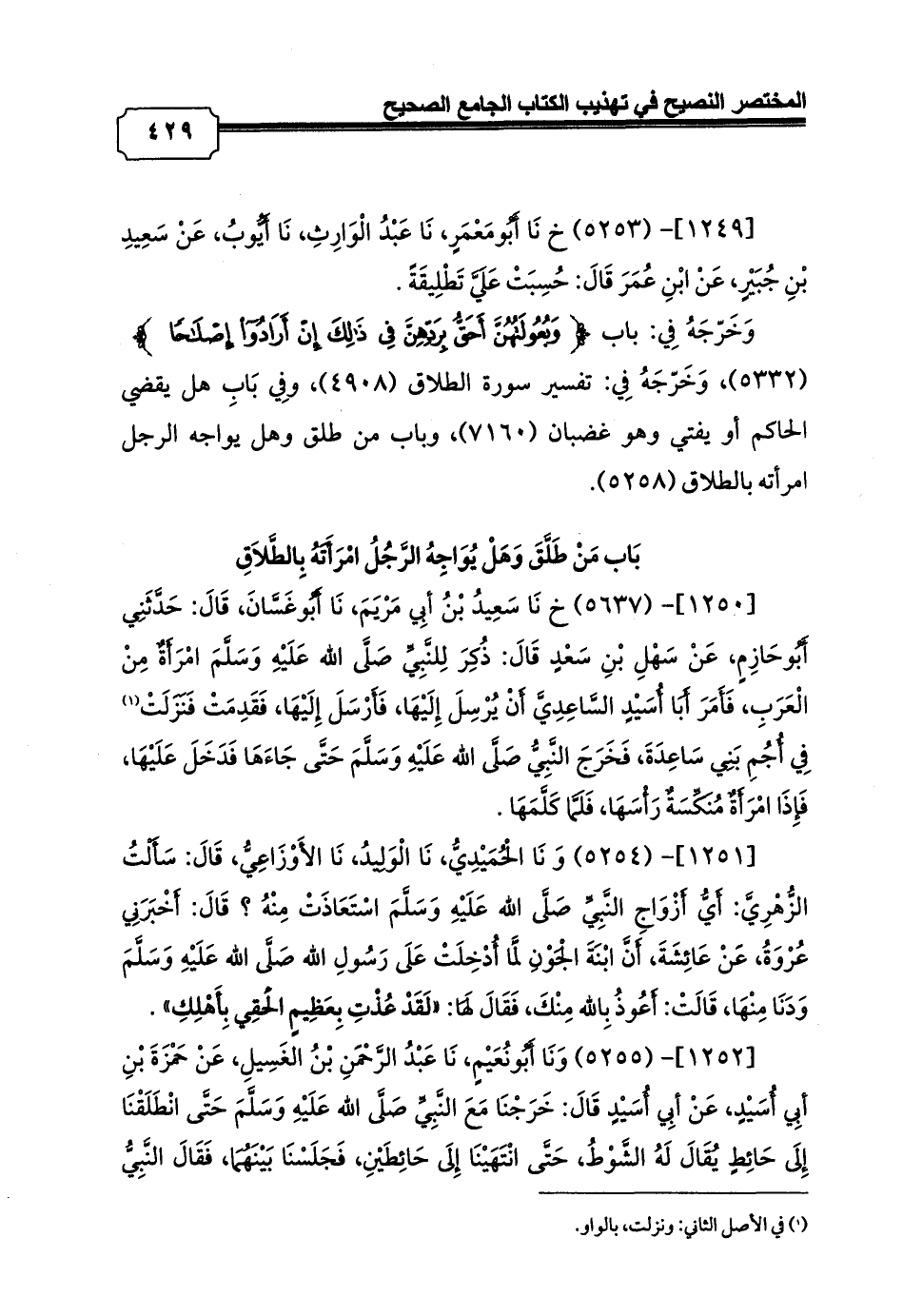 وَخَرّجَهُ فِي: باب {وَبُعُولَتُهُنَّ أَحَقُّ بِرَدِّهِنَّ فِي ذَلِكَ إِنْ أَرَادُوا إِصْلَاحًا} (5332) , وَخَرّجَهُ فِي: تفسير سورة الطلاق (4908)، وفِي بَابِ هل يقضي الحاكم أو يفتي وهو غضبان (7160) , وباب من طلق وهل يواجه الرجل امرأته بالطلاق (5258).