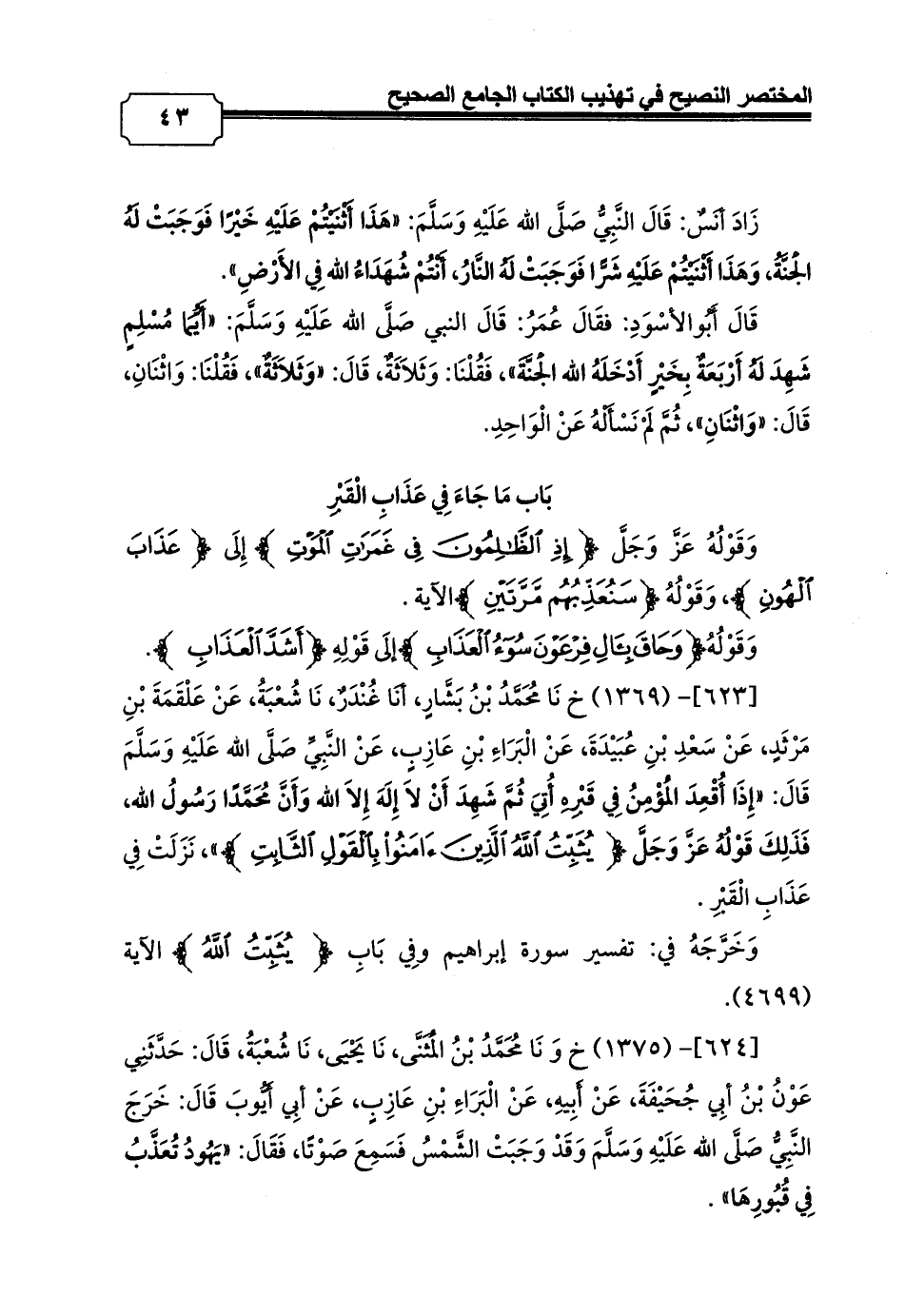 [623]- (1369) خ نَا مُحَمَّدُ بْنُ بَشَّارٍ، أنَا غُنْدَرٌ، نَا شُعْبَةُ، عَنْ عَلْقَمَةَ بْنِ مَرْثَدٍ، عَنْ سَعْدِ بْنِ عُبَيْدَةَ، عَنْ الْبَرَاءِ بْنِ عَازِبٍ، عَنْ النَّبِيِّ صَلَّى الله عَلَيْهِ وَسَلَّمَ قَالَ: «إِذَا أُقْعِدَ الْمُؤْمِنُ فِي قَبْرِهِ أُتِيَ ثُمَّ شَهِدَ أَنْ لاَ إِلَهَ إِلاَ الله وَأَنَّ مُحَمَّدًا رَسُولُ الله، فَذَلِكَ قَوْلُهُ عَزَّ وَجَلَّ {يُثَبِّتُ اللَّهُ الَّذِينَ آمَنُوا بِالْقَوْلِ الثَّابِتِ}»، نَزَلَتْ فِي عَذَابِ الْقَبْرِ.