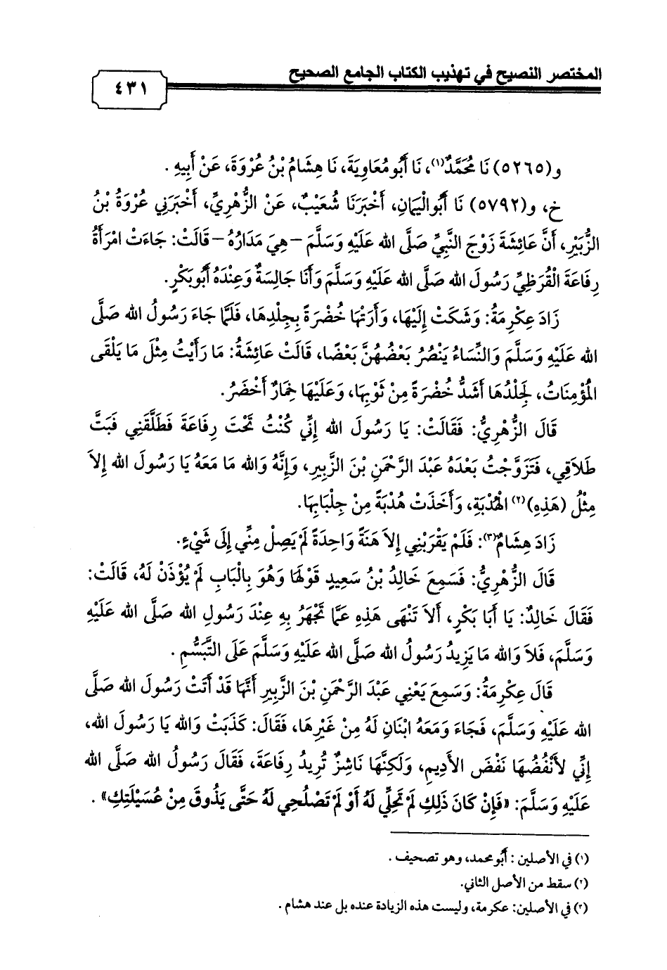 خ، و (5792) نَا أَبُوالْيَمَانِ, أَخْبَرَنَا شُعَيْبٌ, عَنْ الزُّهْرِيِّ, أَخْبَرَنِي عُرْوَةُ بْنُ الزُّبَيْرِ, أَنَّ عَائِشَةَ زَوْجَ النَّبِيِّ صَلَّى الله عَلَيْهِ وَسَلَّمَ - هِيَ مَدَارُهُ - قَالَتْ: جَاءَتْ امْرَأَةُ رِفَاعَةَ الْقُرَظِيِّ رَسُولَ الله صَلَّى الله عَلَيْهِ وَسَلَّمَ وَأَنَا جَالِسَةٌ وَعِنْدَهُ أَبُوبَكْرٍ.