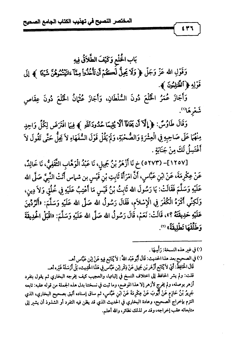 [1257]- (5273) خ نَا أَزْهَرُ بْنُ جَمِيلٍ, نَا عَبْدُ الْوَهَّابِ الثَّقَفِيُّ, نَا خَالِدٌ, عَنْ عِكْرِمَةَ, عَنْ ابْنِ عَبَّاسٍ, أَنَّ امْرَأَةَ ثَابِتِ بْنِ قَيْسٍ بن شماس أَتَتْ النَّبِيَّ صَلَّى الله عَلَيْهِ وَسَلَّمَ فَقَالَتْ: يَا رَسُولَ الله ثَابِتُ بْنُ قَيْسٍ مَا أَعْتِبُ عَلَيْهِ فِي خُلُقٍ وَلاَ دِينٍ, وَلَكِنِّي أَكْرَهُ الْكُفْرَ فِي الْإِسْلاَمِ, فَقَالَ رَسُولُ الله صَلَّى الله عَلَيْهِ وَسَلَّمَ: «أَتَرُدِّينَ عَلَيْهِ حَدِيقَتَهُ؟» , قَالَتْ: نَعَمْ, قَالَ رَسُولُ الله صَلَّى الله عَلَيْهِ وَسَلَّمَ: «اقْبَلْ الْحَدِيقَةَ وَطَلِّقْهَا تَطْلِيقَةً» (¬2).