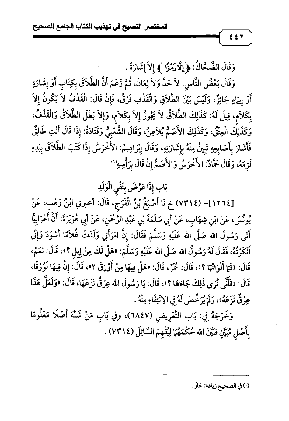 [1264]- (7314) خ نَا أَصْبَغُ بْنُ الْفَرَجِ، قَالَ: أخبرني ابْنُ وَهْبٍ, عَنْ يُونُسَ, عَنْ ابْنِ شِهَابٍ, عَنْ أبِي سَلَمَةَ بْنِ عَبْدِ الرَّحْمَنِ, عَنْ أبِي هُرَيْرَةَ: أَنَّ أَعْرَابِيًّا أَتَى رَسُولَ الله صَلَّى الله عَلَيْهِ وَسَلَّمَ فَقَالَ: إِنَّ امْرَأَتِي وَلَدَتْ غُلاَمًا أَسْوَدَ وَإِنِّي أَنْكَرْتُهُ, فَقَالَ لَهُ رَسُولُ الله صَلَّى الله عَلَيْهِ وَسَلَّمَ: «هَلْ لَكَ مِنْ إِبِلٍ؟» , قَالَ: نَعَمْ, قَالَ: «فَمَا أَلْوَانُهَا؟» , قَالَ: حُمْرٌ, قَالَ: «هَلْ فِيهَا مِنْ أَوْرَقَ؟» , قَالَ: إِنَّ فِيهَا لَوُرْقًا, قَالَ: «فَأَنَّى تُرَى ذَلِكَ جَاءَهَا؟» , قَالَ: يَا رَسُولَ الله عِرْقٌ نَزَعَهَا, قَالَ: «وَلَعَلَّ هَذَا عِرْقٌ نَزَعَهُ»، وَلَمْ يُرَخِّصْ لَهُ فِي الِانْتِفَاءِ مِنْهُ.