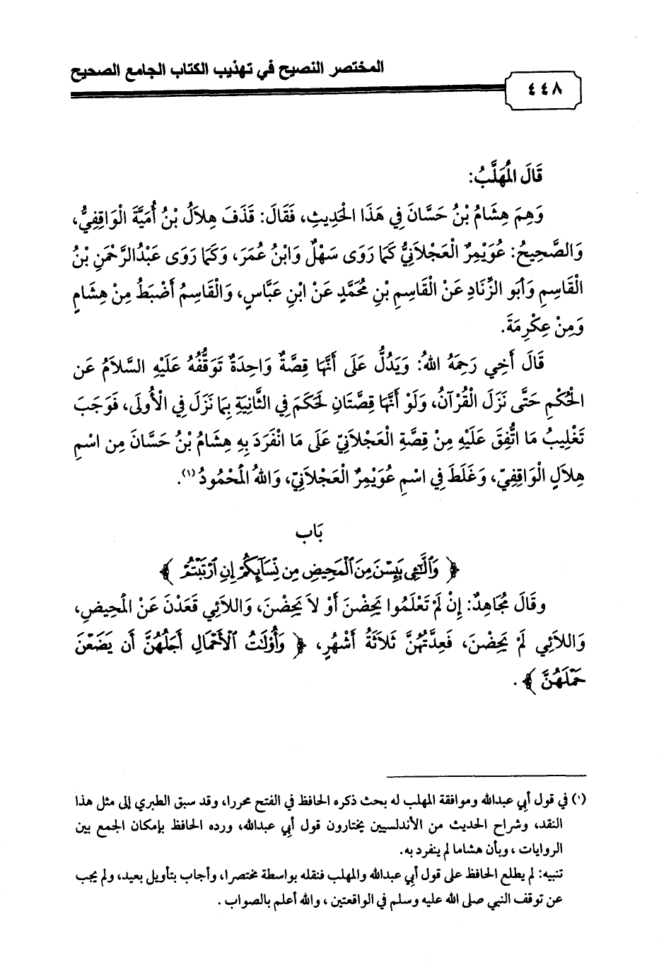 (¬1) في قول أبِي عبد الله وموافقة المهلب له مبحث ذكره الحافظ في الفتح محررا، وقد سبق الطبري إلى مثل هذا النقد، وشراح الحديث من الأندلسيين يختارون قول أبِي عبد الله، ورده الحافظ بإمكان الجمع بين الروايات، وبأن هشاما لم ينفرد به.