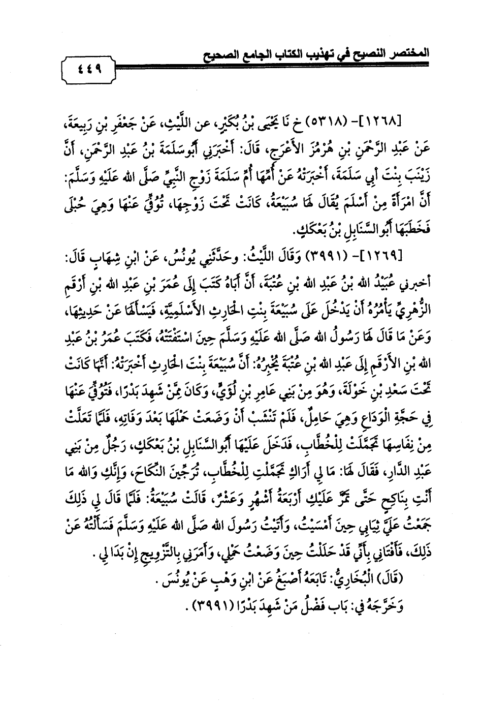 [1269]- (3991) وَقَالَ اللَّيْثُ: وحَدَّثَنِي يُونُسُ, عَنْ ابْنِ شِهَابٍ قَالَ: أخبرني عُبَيْدُ الله بْنُ عَبْدِ الله بْنِ عُتْبَةَ, أَنَّ أَبَاهُ كَتَبَ إِلَى عُمَرَ بْنِ عَبْدِ الله بْنِ أَرْقَمِ الزُّهْرِيِّ يَأْمُرُهُ أَنْ يَدْخُلَ عَلَى سُبَيْعَةَ بِنْتِ الْحَارِثِ الأَسْلَمِيَّةِ, فَيَسْأَلَهَا عَنْ حَدِيثِهَا, وَعَنْ مَا قَالَ لَهَا رَسُولُ الله صَلَّى الله عَلَيْهِ وَسَلَّمَ حِينَ اسْتَفْتَتْهُ, فَكَتَبَ عُمَرُ بْنُ عَبْدِ الله بْنِ الأَرْقَمِ إِلَى عَبْدِ الله بْنِ عُتْبَةَ يُخْبِرُهُ: أَنَّ سُبَيْعَةَ بِنْتَ الْحَارِثِ أَخْبَرَتْهُ: أَنَّهَا كَانَتْ تَحْتَ سَعْدِ بْنِ خَوْلَةَ, وَهُوَ مِنْ بَنِي عَامِرِ بْنِ لُؤَيٍّ, وَكَانَ مِمَّنْ شَهِدَ بَدْرًا, فَتُوُفِّيَ عَنْهَا فِي حَجَّةِ الْوَدَاعِ وَهِيَ حَامِلٌ, فَلَمْ تَنْشَبْ أَنْ وَضَعَتْ حَمْلَهَا بَعْدَ وَفَاتِهِ, فَلَمَّا تَعَلَّتْ مِنْ نِفَاسِهَا تَجَمَّلَتْ لِلْخُطَّابِ, فَدَخَلَ عَلَيْهَا أَبُوالسَّنَابِلِ بْنُ بَعْكَكٍ, رَجُلٌ مِنْ بَنِي عَبْدِ الدَّارِ, فَقَالَ لَهَا: مَا لِي أَرَاكِ تَجَمَّلْتِ لِلْخُطَّابِ, تُرَجِّينَ النِّكَاحَ, وَإِنَّكِ وَالله مَا أَنْتِ بِنَاكِحٍ حَتَّى تَمُرَّ عَلَيْكِ أَرْبَعَةُ أَشْهُرٍ وَعَشْرٌ, قَالَتْ سُبَيْعَةُ: فَلَمَّا قَالَ لِي ذَلِكَ جَمَعْتُ عَلَيَّ ثِيَابِي حِينَ أَمْسَيْتُ, وَأَتَيْتُ رَسُولَ الله صَلَّى الله عَلَيْهِ وَسَلَّمَ فَسَأَلْتُهُ عَنْ ذَلِكَ, فَأَفْتَانِي بِأَنِّي قَدْ حَلَلْتُ حِينَ وَضَعْتُ حَمْلِي, وَأَمَرَنِي بِالتَّزْوِيجِ إِنْ بَدَا لِي.