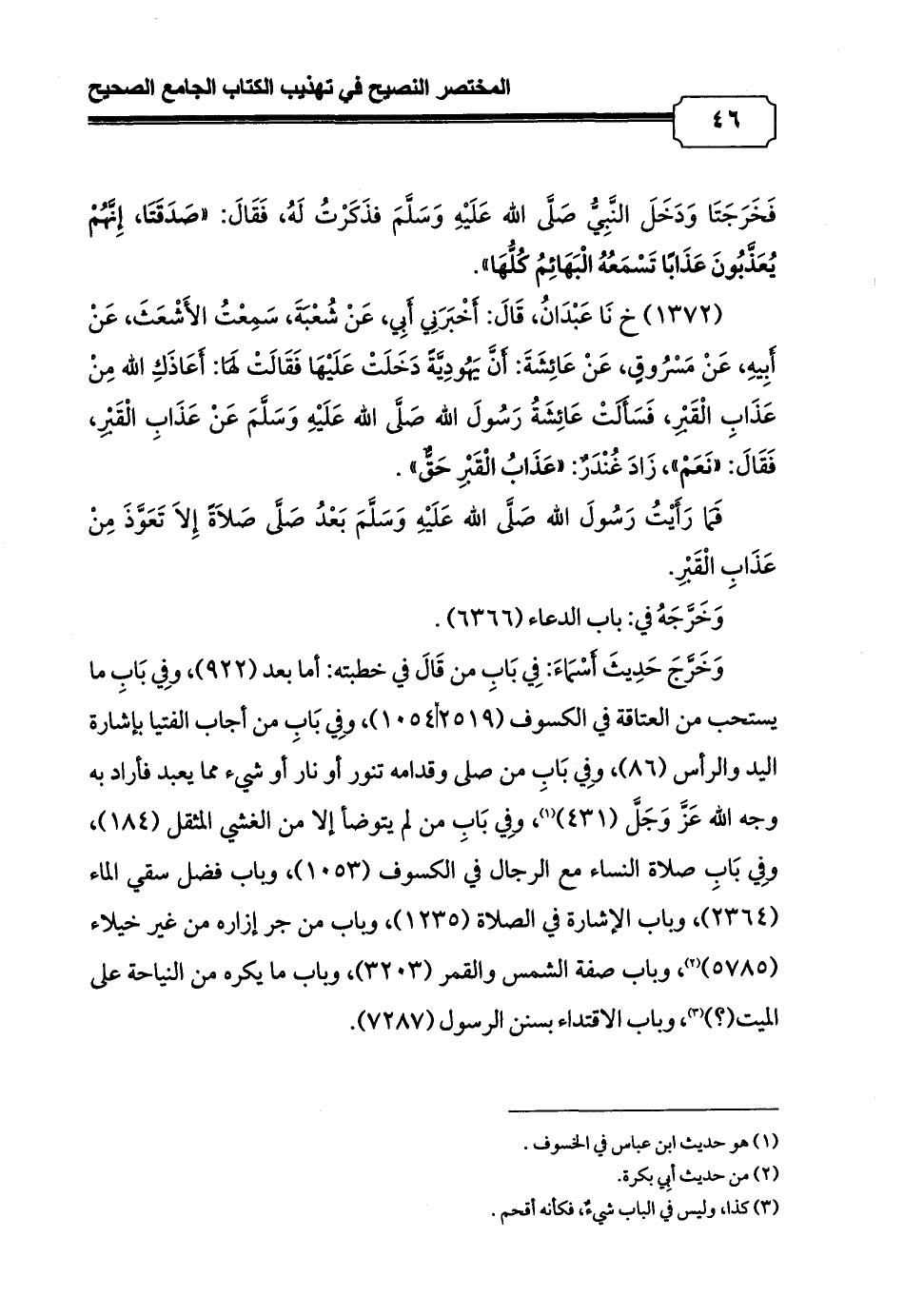 (1372) خ نَا عَبْدَانُ، قَالَ: أَخْبَرَنِي أَبِي، عَنْ شُعْبَةَ، سَمِعْتُ الأَشْعَثَ، عَنْ أَبِيهِ، عَنْ مَسْرُوقٍ، عَنْ عَائِشَةَ: أَنَّ يَهُودِيَّةً دَخَلَتْ عَلَيْهَا فَقَالَتْ لَهَا: أَعَاذَكِ الله مِنْ عَذَابِ الْقَبْرِ, فَسَأَلَتْ عَائِشَةُ رَسُولَ الله صَلَّى الله عَلَيْهِ وَسَلَّمَ عَنْ عَذَابِ الْقَبْرِ, فَقَالَ: «نَعَمْ»، زَادَ غُنْدَرٌ: «عَذَابُ الْقَبْرِ حَقٌّ».