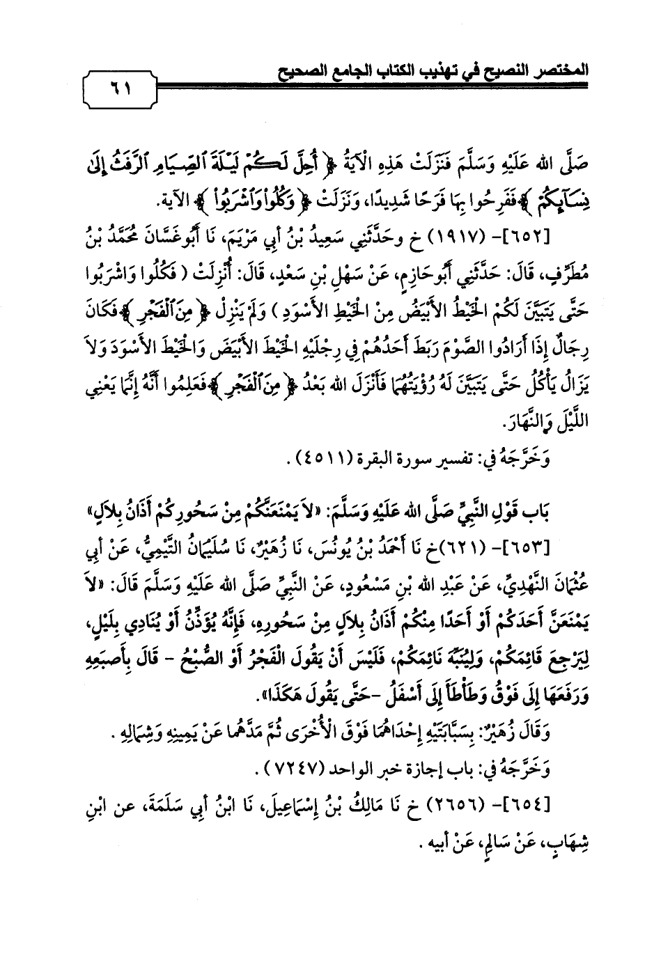 [653]- (621) خ نَا أَحْمَدُ بْنُ يُونُسَ، نَا زُهَيْرٌ، نَا سُلَيْمَانُ التَّيْمِيُّ، عَنْ أبِي عُثْمَانَ النَّهْدِيِّ، عَنْ عَبْدِ الله بْنِ مَسْعُودٍ، عَنْ النَّبِيِّ صَلَّى الله عَلَيْهِ وَسَلَّمَ قَالَ: «لاَ يَمْنَعَنَّ أَحَدَكُمْ أَوْ أَحَدًا مِنْكُمْ أَذَانُ بِلاَلٍ مِنْ سَحُورِهِ, فَإِنَّهُ يُؤَذِّنُ أَوْ يُنَادِي بِلَيْلٍ، لِيَرْجِعَ قَائِمَكُمْ, وَلِيُنَبِّهَ نَائِمَكُمْ, فَلَيْسَ أَنْ يَقُولَ الْفَجْرُ أَوْ الصُّبْحُ - قَالَ بِأَصبَعِهِ وَرَفَعَهَا إِلَى فَوْقُ وَطَأْطَأَ إِلَى أَسْفَلُ -حَتَّى يَقُولَ هَكَذَا».
