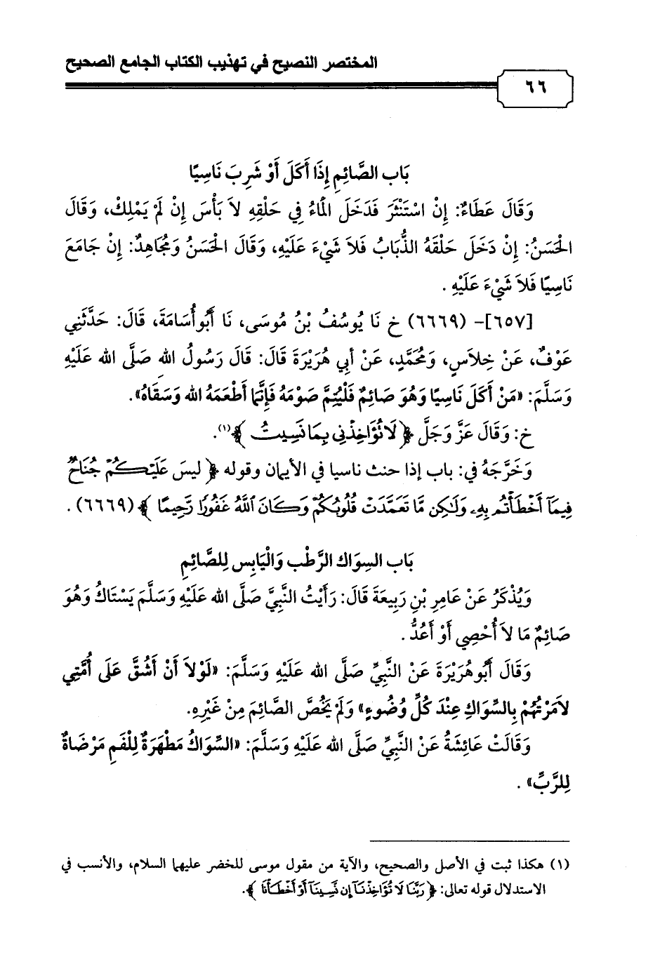 [657]- (6669) خ نَا يُوسُفُ بْنُ مُوسَى، نَا أَبُوأُسَامَةَ، قَالَ: حَدَّثَنِي عَوْفٌ، عَنْ خِلاَسٍ، وَمُحَمَّدٍ، عَنْ أبِي هُرَيْرَةَ قَالَ: قَالَ رَسُولُ اللهِ صَلَّى الله عَلَيْهِ وَسَلَّمَ: «مَنْ أَكَلَ نَاسِيًا وَهُوَ صَائِمٌ فَلْيُتِمَّ صَوْمَهُ فَإِنَّمَا أَطْعَمَهُ الله وَسَقَاهُ».