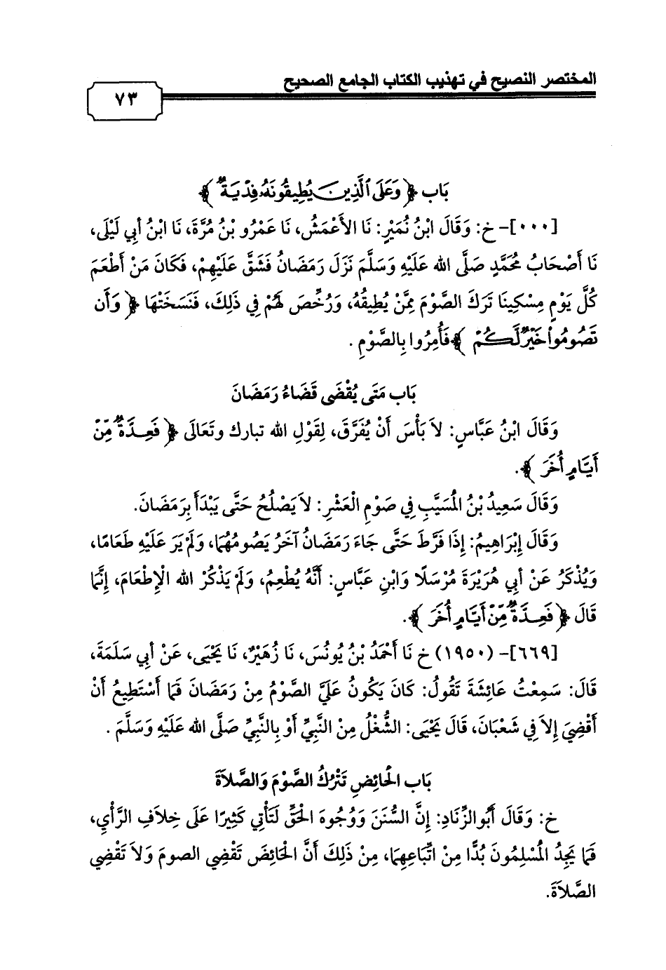 [000]- خ: وَقَالَ ابْنُ نُمَيْرٍ: نَا الأَعْمَشُ، نَا عَمْرُو بْنُ مُرَّةَ، نَا ابْنُ أبِي لَيْلَى، نَا أَصْحَابُ مُحَمَّدٍ صَلَّى الله عَلَيْهِ وَسَلَّمَ نَزَلَ رَمَضَانُ فَشَقَّ عَلَيْهِمْ, فَكَانَ مَنْ أَطْعَمَ كُلَّ يَوْمٍ مِسْكِينَا تَرَكَ الصَّوْمَ مِمَّنْ يُطِيقُهُ, وَرُخِّصَ لَهُمْ فِي ذَلِكَ, فَنَسَخَتْهَا {وَأَنْ تَصُومُوا خَيْرٌ لَكُمْ} فَأُمِرُوا بِالصَّوْمِ.