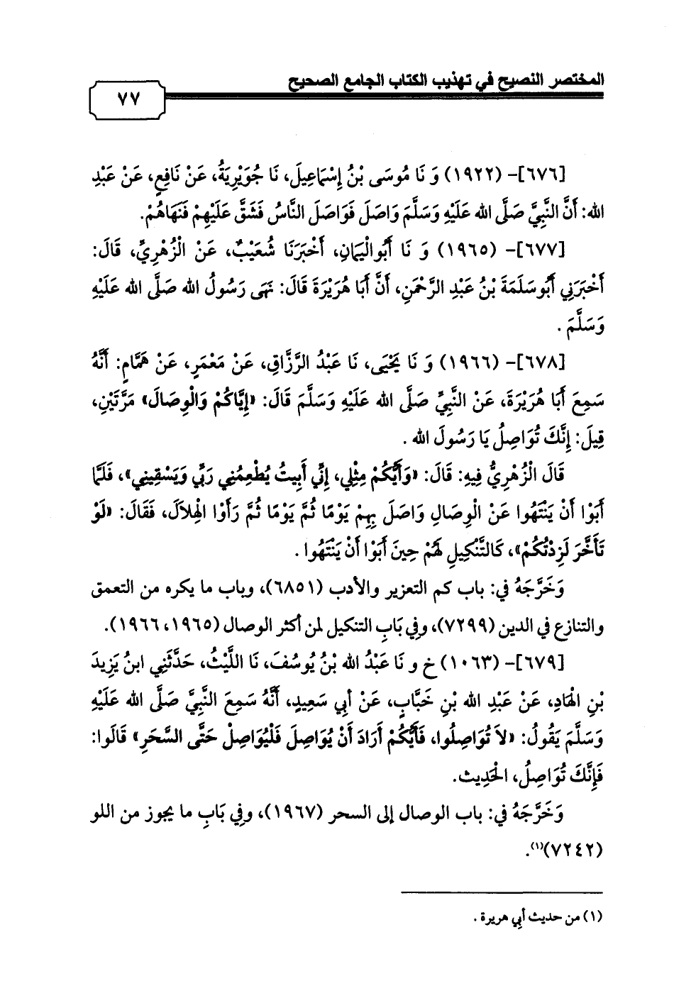 [676]- (1922) وَنَا مُوسَى بْنُ إِسْمَاعِيلَ، نَا جُوَيْرِيَةُ، عَنْ نَافِعٍ، عَنْ عَبْدِ الله: أَنَّ النَّبِيَّ صَلَّى الله عَلَيْهِ وَسَلَّمَ وَاصَلَ فَوَاصَلَ النَّاسُ فَشَقَّ عَلَيْهِمْ فَنَهَاهُمْ.