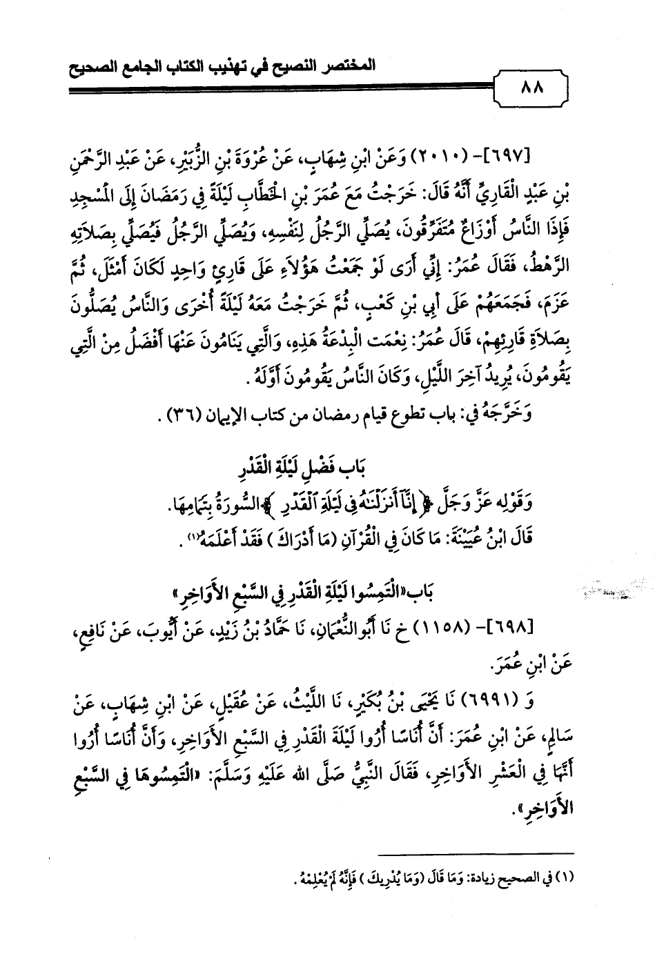[697]- (2010) وَعَنْ ابْنِ شِهَابٍ، عَنْ عُرْوَةَ بْنِ الزُّبَيْرِ، عَنْ عَبْدِ الرَّحْمَنِ بْنِ عَبْدٍ الْقَارِيِّ أَنَّهُ قَالَ: خَرَجْتُ مَعَ عُمَرَ بْنِ الْخَطَّابِ لَيْلَةً فِي رَمَضَانَ إِلَى الْمَسْجِدِ فَإِذَا النَّاسُ أَوْزَاعٌ مُتَفَرِّقُونَ، يُصَلِّي الرَّجُلُ لِنَفْسِهِ، وَيُصَلِّي الرَّجُلُ فَيُصَلِّي بِصَلاَتِهِ الرَّهْطُ, فَقَالَ عُمَرُ: إِنِّي أَرَى لَوْ جَمَعْتُ هَؤُلاَءِ عَلَى قَارِئٍ وَاحِدٍ لَكَانَ أَمْثَلَ, ثُمَّ عَزَمَ, فَجَمَعَهُمْ عَلَى أبِي بْنِ كَعْبٍ, ثُمَّ خَرَجْتُ مَعَهُ لَيْلَةً أُخْرَى وَالنَّاسُ يُصَلُّونَ بِصَلاَةِ قَارِئِهِمْ, قَالَ عُمَرُ: نِعْمَت الْبِدْعَةُ هَذِهِ، وَالَّتِي يَنَامُونَ عَنْهَا أَفْضَلُ مِنْ الَّتِي يَقُومُونَ, يُرِيدُ آخِرَ اللَّيْلِ, وَكَانَ النَّاسُ يَقُومُونَ أَوَّلَهُ.