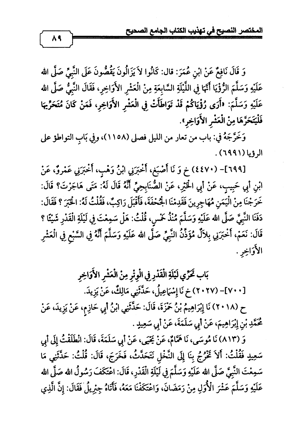 وَقَالَ نَافِعٌ عَنْ ابْنِ عُمَرَ: قال: كَانُوا لاَ يَزَالُونَ يَقُصُّونَ عَلَى النَّبِيِّ صَلَّى الله عَلَيْهِ وَسَلَّمَ الرُّؤْيَا أَنَّهَا فِي اللَّيْلَةِ السَّابِعَةِ مِنْ الْعَشْرِ الأَوَاخِرِ, فَقَالَ النَّبِيُّ صَلَّى الله عَلَيْهِ وَسَلَّمَ: «أَرَى رُؤْيَاكُمْ قَدْ تَوَاطَأَتْ فِي الْعَشْرِ الأَوَاخِرِ، فَمَنْ كَانَ مُتَحَرِّيهَا فَلْيَتَحَرَّهَا مِنْ الْعَشْرِ الأَوَاخِرِ».