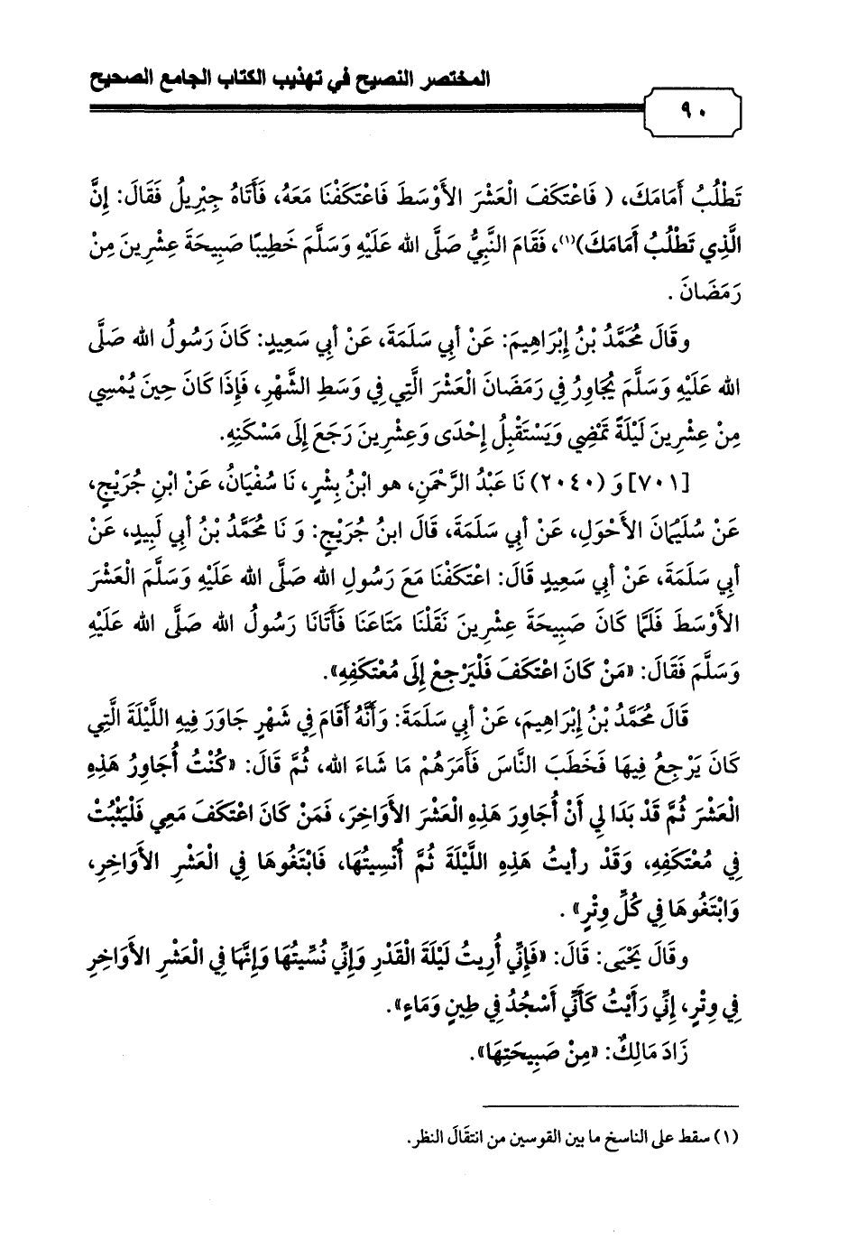 قَالَ مُحَمَّدُ بْنُ إِبْرَاهِيمَ، عَنْ أبِي سَلَمَةَ: وَأَنَّهُ أَقَامَ فِي شَهْرٍ جَاوَرَ فِيهِ اللَّيْلَةَ الَّتِي كَانَ يَرْجِعُ فِيهَا فَخَطَبَ النَّاسَ فَأَمَرَهُمْ مَا شَاءَ الله, ثُمَّ قَالَ: «كُنْتُ أُجَاوِرُ هَذِهِ الْعَشْرَ ثُمَّ قَدْ بَدَا لِي أَنْ أُجَاوِرَ هَذِهِ الْعَشْرَ الأَوَاخِرَ, فَمَنْ كَانَ اعْتَكَفَ مَعِي فَلْيَثْبُتْ فِي مُعْتَكَفِهِ، وَقَدْ رأيتُ هَذِهِ اللَّيْلَةَ ثُمَّ أُنْسِيتُهَا, فَابْتَغُوهَا فِي الْعَشْرِ الأَوَاخِرِ، وَابْتَغُوهَا فِي كُلِّ وِتْرٍ».