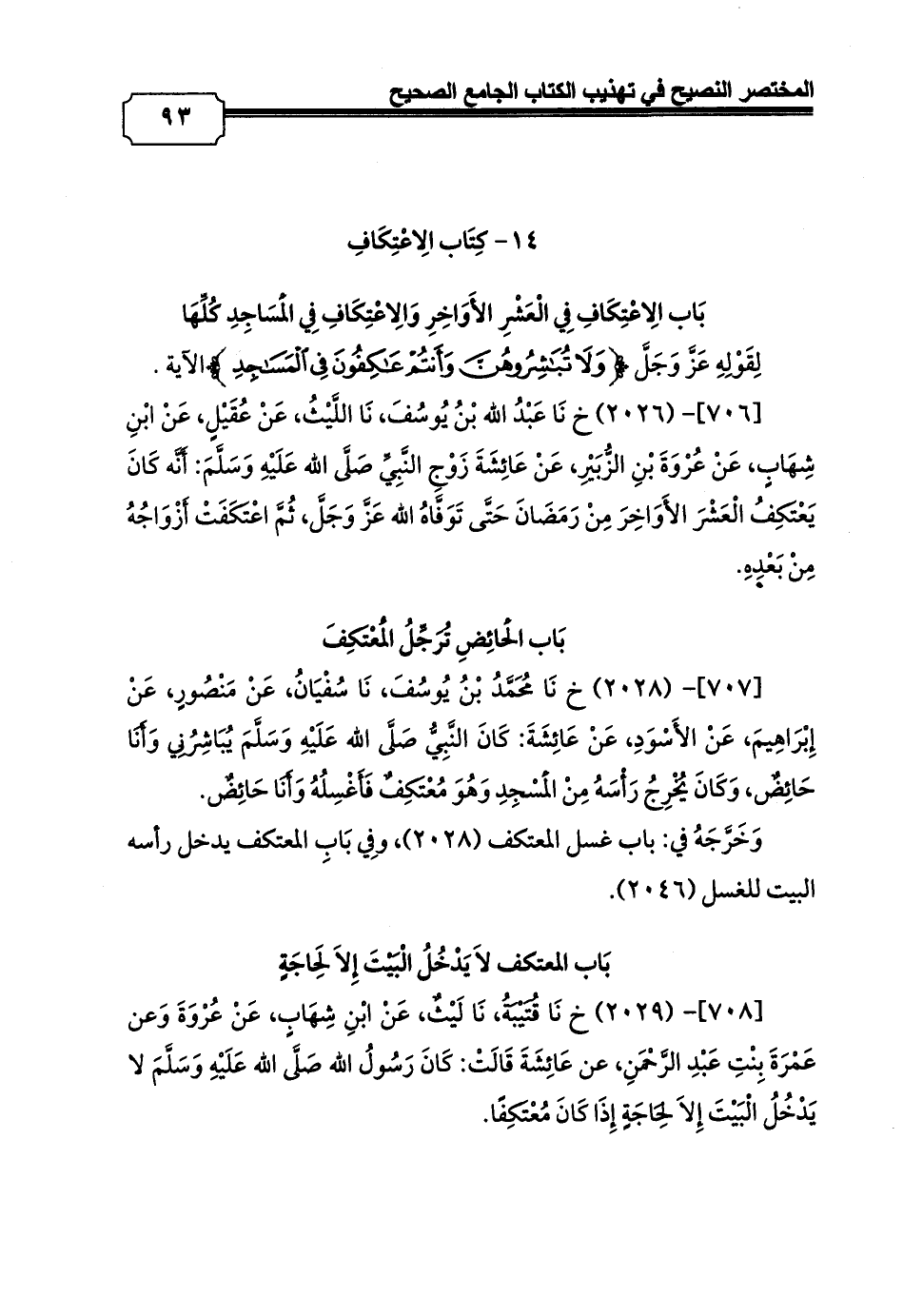 [706]- (2026) خ نَا عَبْدُ الله بْنُ يُوسُفَ، نَا اللَّيْثُ، عَنْ عُقَيْلٍ، عَنْ ابْنِ شِهَابٍ، عَنْ عُرْوَةَ بْنِ الزُّبَيْرِ، عَنْ عَائِشَةَ زَوْجِ النَّبِيِّ صَلَّى الله عَلَيْهِ وَسَلَّمَ: أَنَّه كَانَ يَعْتَكِفُ الْعَشْرَ الأَوَاخِرَ مِنْ رَمَضَانَ حَتَّى تَوَفَّاهُ الله عَزَّ وَجَلَّ, ثُمَّ اعْتَكَفَتْ أَزْوَاجُهُ مِنْ بَعْدِهِ.