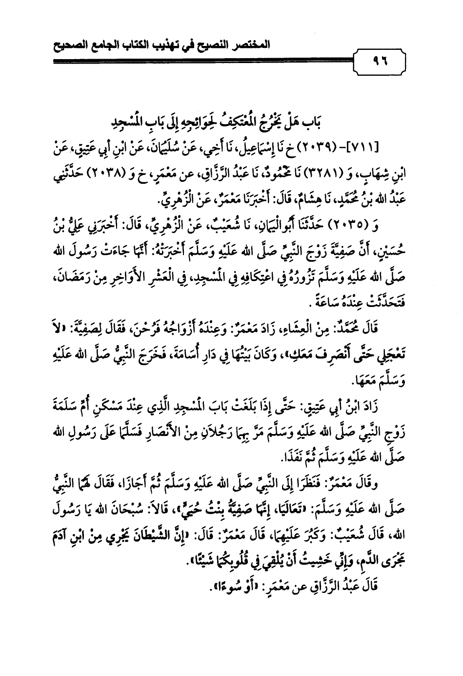 وَ (2035) حَدَّثَنَا أَبُوالْيَمَانِ، نَا شُعَيْبٌ، عَنْ الْزُهْرِيِّ، قَالَ: أَخْبَرَنِي عَلِيُّ بْنُ حُسَيْنٍ، أَنَّ صَفِيَّةَ زَوْجَ النَّبِيِّ صَلَّى الله عَلَيْهِ وَسَلَّمَ أَخْبَرَتْهُ: أَنَّهَا جَاءَتْ رَسُولَ الله صَلَّى الله عَلَيْهِ وَسَلَّمَ تَزُورُهُ فِي اعْتِكَافِهِ فِي الْمَسْجِدِ، فِي الْعَشْرِ الأَوَاخِرِ مِنْ رَمَضَانَ، فَتَحَدَّثَتْ عِنْدَهُ سَاعَةً.