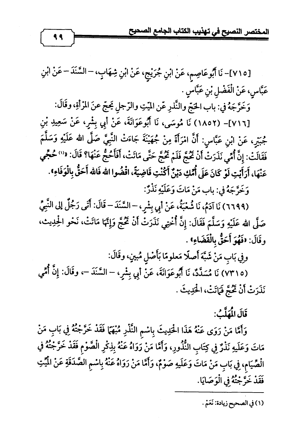وَأَمَّا مَنْ رَوَى عَنْهُ هَذَا الْحَدِيثَ بِاسْمِ النَّذْرِ مُبْهَمًا فَقَدْ خَرَّجْتُهُ فِي بَابِ مَنْ مَاتَ وَعَلَيهِ نَذْرٌ فِي كِتَابِ النُّذُورِ، وَأَمَّا مَنْ رَوَاهُ عَنْهُ بِذِكْرِ الْصَّوْمِ فَقَدْ خَرَّجْتُهُ في الْصِّيَامِ, فِي بَابِ مَنْ مَاتَ وَعَلَيهِ صَوْمٌ، وَأَمَّا مَنْ رَوَاهُ عَنْهُ بِاسْمِ الصَّدَقَةِ عَنْ الْمَيِّتِ فَقَدْ خَرَّجْتُهُ فِي الْوَصَايَا.