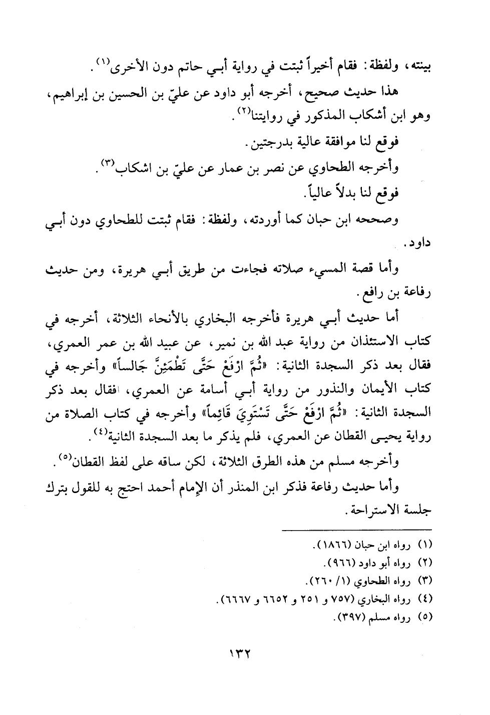 وأما حديث رفاعة فذكر ابن المنذر أن الإمام أحمد احتج به للقول بترك جلسة الاستراحة.