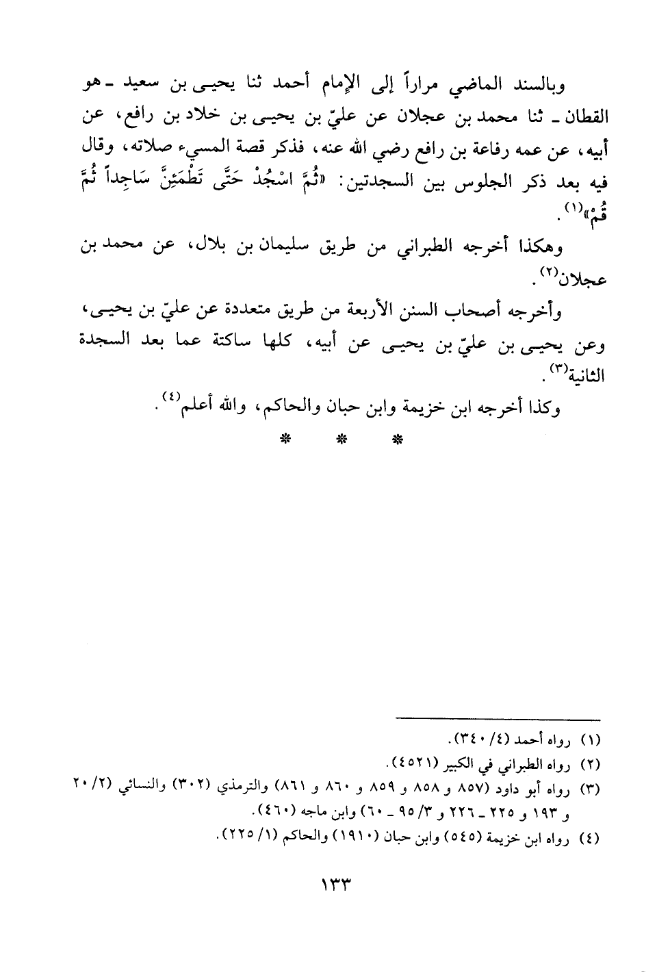 وبالسند الماضي مراراً إلى الإمام أحمد ثنا يحيى بن سعيد -هو القطان- ثنا محمد بن عجلان عن علي بن يحيى بن خلاد بن رافع، عن أبيه، عن عمه رفاعة بن رافع رضي الله عنه، فذكر قصة المسيء صلاته، وقال فيه بعد ذكر الجلوس بين السجدتين: ((ثم اسجد حتى تطمئن ساجداً ثم قم)).