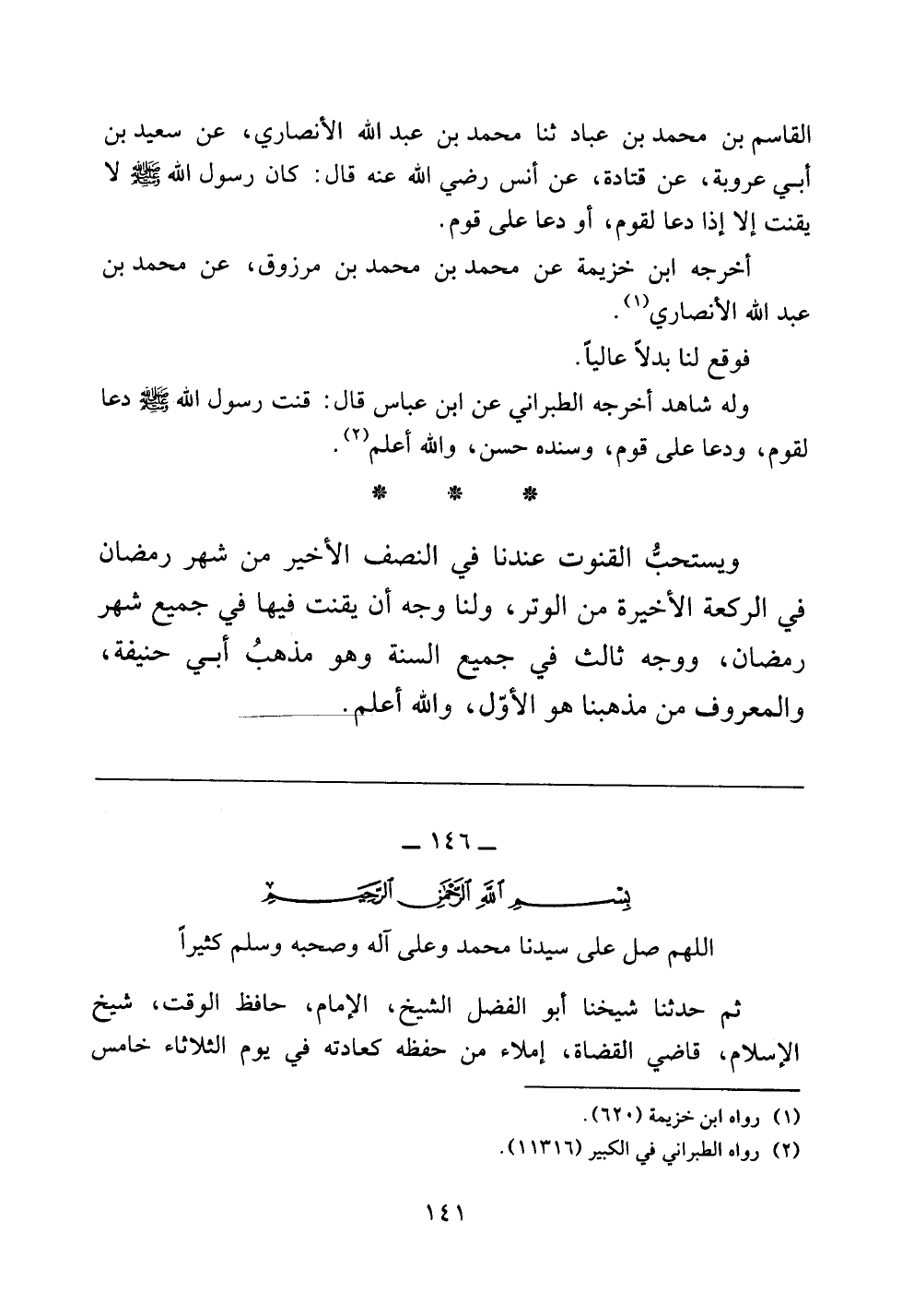 القاسم بن محمد بن عباد ثنا محمد بن عبد الله الأنصاري، عن سعيد بن أبي عروبة، عن قتادة، عن أنس رضي الله عنه قال: كان رسول الله صلى الله عليه وسلم لا يقنت إلا إذا دعا لقوم، أو دعا على قوم.