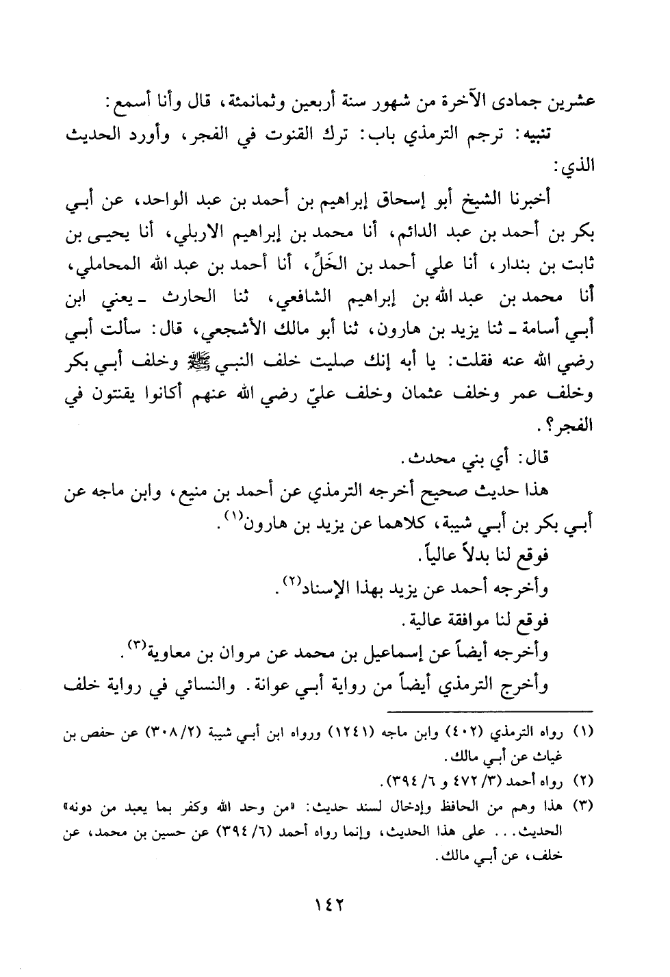 أخبرنا الشيخ أبو إسحاق إبراهيم بن أحمد بن عبد الواحد، عن أبي بكر بن أحمد بن عبد الدائم، أنا محمد بن إبراهيم الأربلي، أنا يحيى بن ثابت بن بندار، أنا علي أحمد بن الخل، أنا أحمد بن عبد الله المحاملي، أنا محمد بن عبد الله بن إبراهيم الشافعي، ثنا الحارث -يعني ابن أبي أسامة- ثنا يزيد بن هارون، ثنا أبو مالك الأشجعي، قال: سألت أبي رضي الله عنه فقلت: يا أبه إنك صليت خلف النبي صلى الله عليه وسلم وخلف أبي بكر وخلف عمر وخلف عثمان وخلف علي رضي الله عنهم أكانوا يقنتون في الفجر؟.