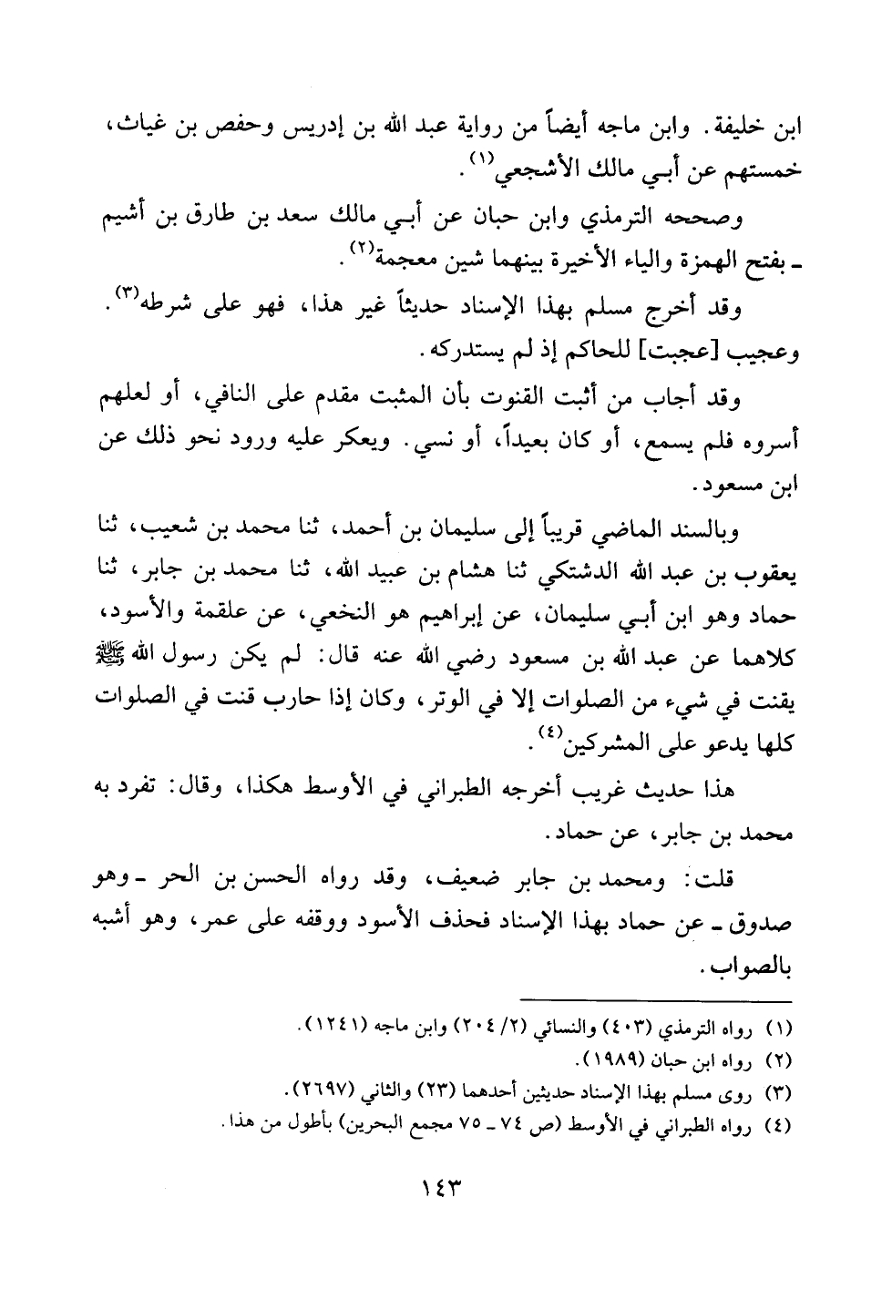 وبالسند الماضي قريباً إلى سليمان بن أحمد، ثنا محمد بن شعيب، ثنا يعقوب بن عبد الله الدشتكي ثنا هشام بن عبيد الله، ثنا محمد بن جابر، ثنا حماد وهو ابن أبي سليمان، عن إبراهيم هو النخعي، عن علقمة والأسود، كلاهما عن عبد الله بن مسعود رضي الله عنه قال: لم يكن رسول الله صلى الله عليه وسلم يقنت في شيء من الصلوات إلا في الوتر، وكان إذا حارب قنت في الصلوات كلها يدعو على المشركين.