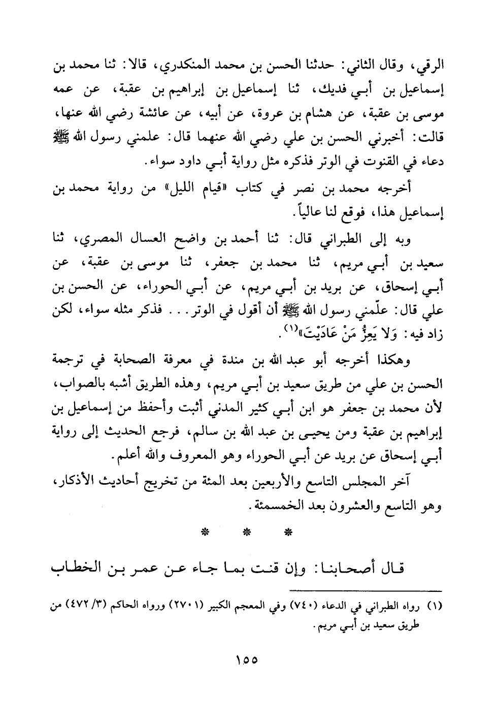 وبه إلى الطبراني قال: ثنا أحمد بن واضح العسال المصري، ثنا سعيد بن أبي مريم، ثنا محمد بن جعفر، ثنا موسى بن عقبة، عن أبي إسحاق، عن بريد بن أبي مريم، عن أبي الحوراء، عن الحسن بن علي قال: علمني رسول الله صلى الله عليه وسلم أن أقول في الوتر .. .. فذكر مثله سواء، لكن زاد فيه: ((ولا يعز من عاديت)).