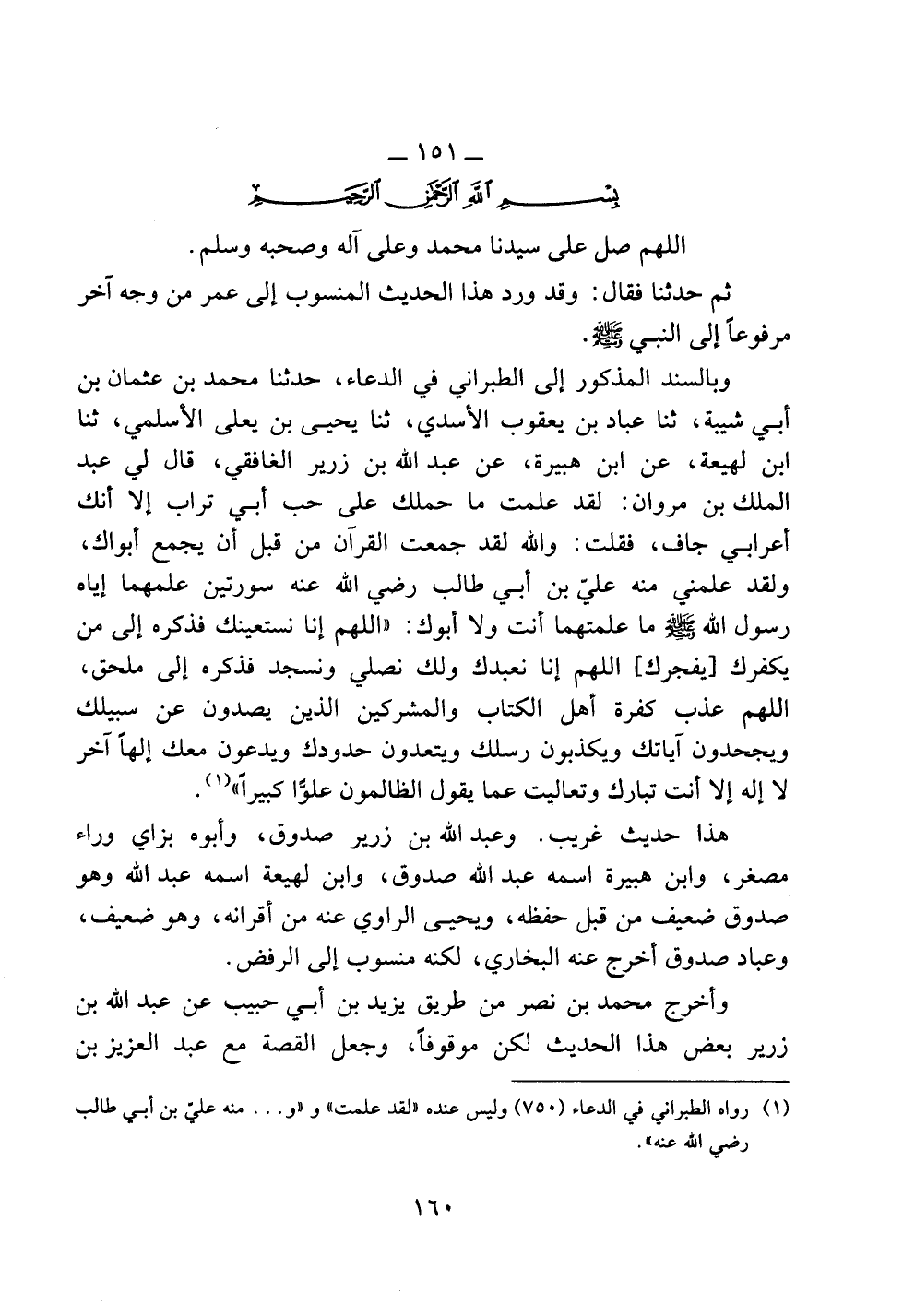 وبالسند المذكور إلى الطبراني في الدعاء، حدثنا محمد بن عثمان بن أبي شيبة، ثنا عباد بن يعقوب الأسدي، ثنا يحيى بن يعلى الأسلمي، ثنا ابن لهيعة، عن ابن هبيرة، عن عبد الله بن زرير الغافقي، قال لي عبد الملك بن مروان: لقد علمت ما حملك على حب أبي تراب إلا أنك أعرابي جاف، فقلت: والله لقد جمعت القرآن من قبل أن يجمع أبواك، ولقد علمني منه علي بن أبي طالب رضي الله عنه سورتين علمهما إياه رسول الله صلى الله عليه وسلم ما علمتهما أنت ولا أبوك: ((اللهم إنا نستعينك فذكره إلى أن يكفرك [يفجرك] اللهم إنا نعبدك ولك نصلي ونسجد فذكره إلى ملحق، اللهم عذب كفرة أهل الكتاب والمشركين الذين يصدون عن سبيلك ويجحدون آياتك ويكذبون رسلك ويتعدون حدودك ويدعون معك إلهاً آخر لا إله إلا أنت تباركت وتعاليت عما يقول الظالمون علواً كبيراً)).
