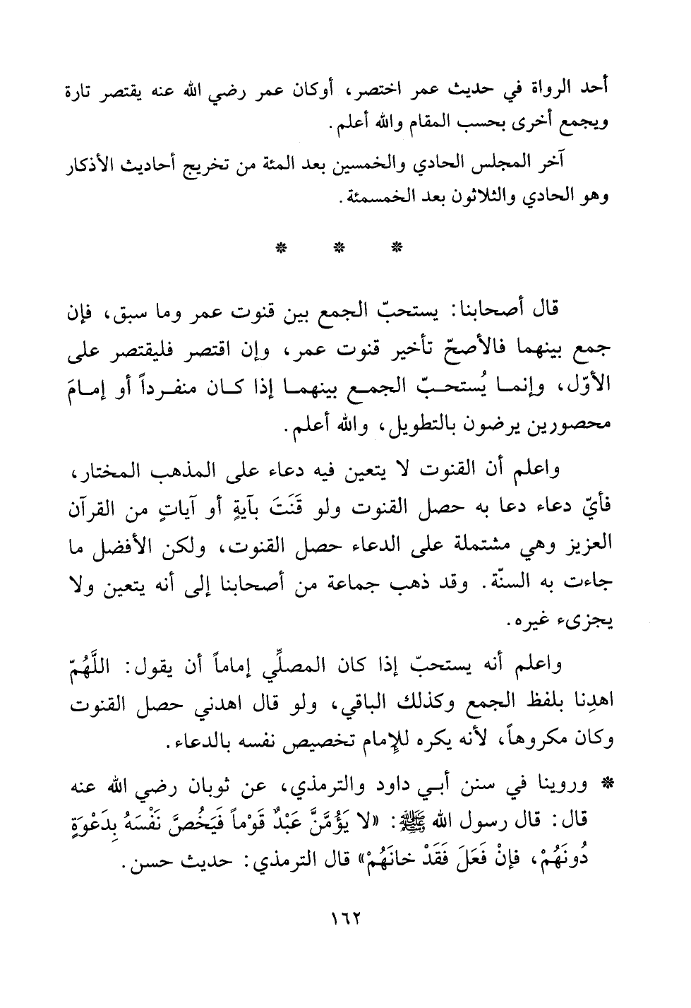[[قال أصحابنا: يستحب الجمع بين قنوت عمر وما سبق، فإن جمع بينهما فالأصح تأخير قنوت عمر، وإن اقتصر فليقتصر على الأول، وإنما يستحب الجمع بينهما إذا كان منفرداً أو إمام محصورين يرضون بالتطويل، والله أعلم.
