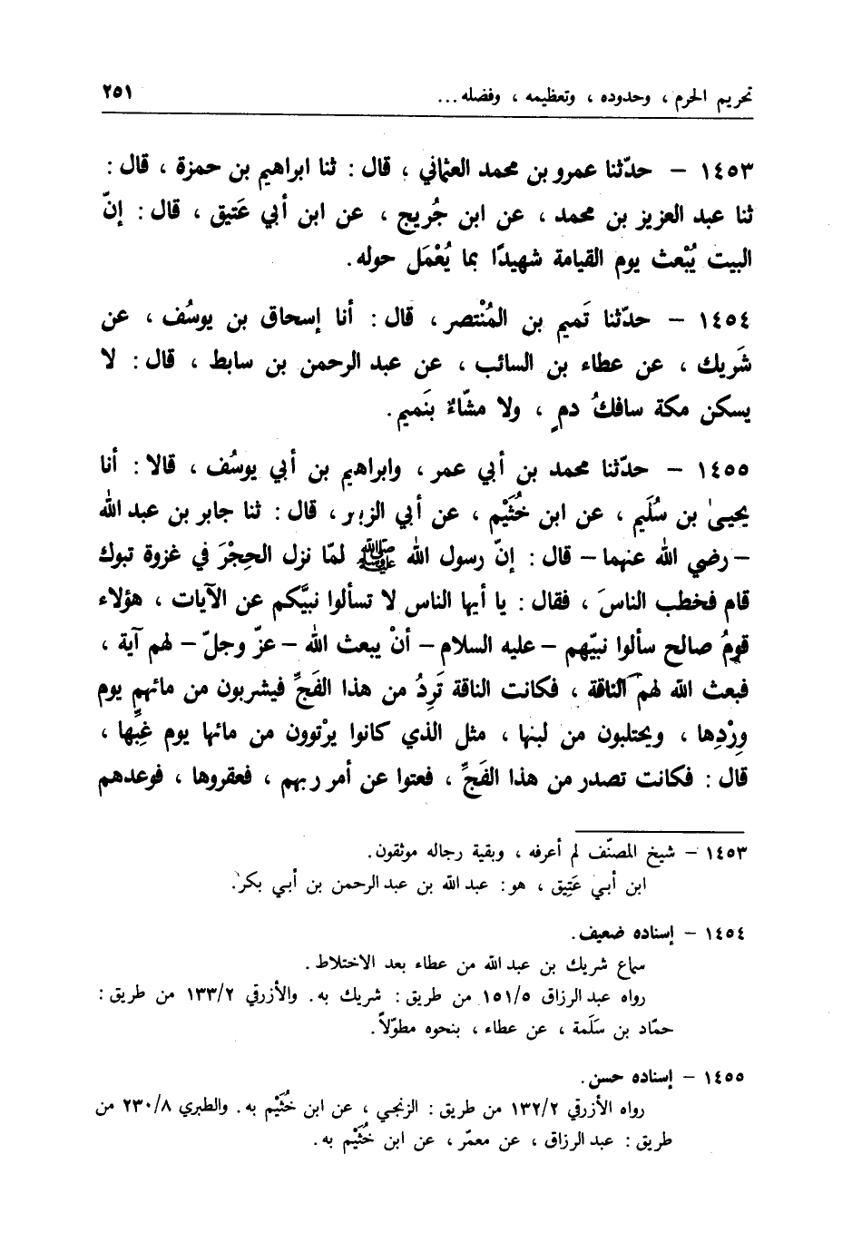 1494 - حَدَّثَنَا حُسَيْنُ بْنُ حَسَنٍ الْمَرْوَزِيُّ قَالَ: ثنا مَرْوَانُ بْنُ مُعَاوِيَةَ قَالَ: ثنا حَاتِمُ بْنُ أَبِي صَغِيرَةَ، عَنِ ابْنِ أَبِي مُلَيْكَةَ قَالَ: قَالَ ابْنُ الزُّبَيْرِ رَضِيَ اللهُ عَنْهُمَا: " إِنَّ §هَذَا الْبَيْتَ كَانَ يَحُجُّهُ مِنْ بَنِي إِسْرَائِيلَ سَبْعُمِائَةِ أَلْفٍ، يَضَعُونَ نِعَالَهُمْ بِالتَّنْعِيمِ ثُمَّ يَدْخُلُونَ حُفَاةً تَعْظِيمًا لَهُ "