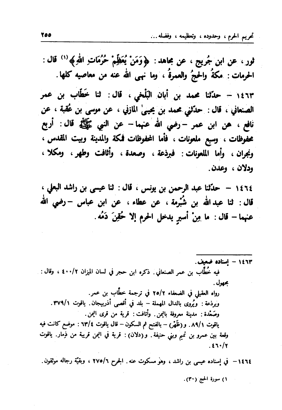 1505 - حَدَّثَنَا حُسَيْنُ بْنُ حَسَنٍ قَالَ: أنا عَبْدُ اللهِ بْنُ جَعْفَرٍ، عَنْ عِيسَى بْنِ يُونُسَ، عَنِ الْأَعْمَشِ، عَنْ رَجُلٍ، عَنْ عَبْدِ اللهِ بْنِ عَمْرٍو رَضِيَ اللهُ -[271]- عَنْهُمَا قَالَ: " §الْحَرَمُ مُحَرَّمٌ بِمِقْدَارِهِ مِنَ السَّمَاوَاتِ وَالْأَرْضِ، وَبَيْتُ الْمَقْدِسِ مُقَدَّسٌ بِمِقْدَارِهِ مِنَ السَّمَاوَاتِ وَالْأَرْضِ "