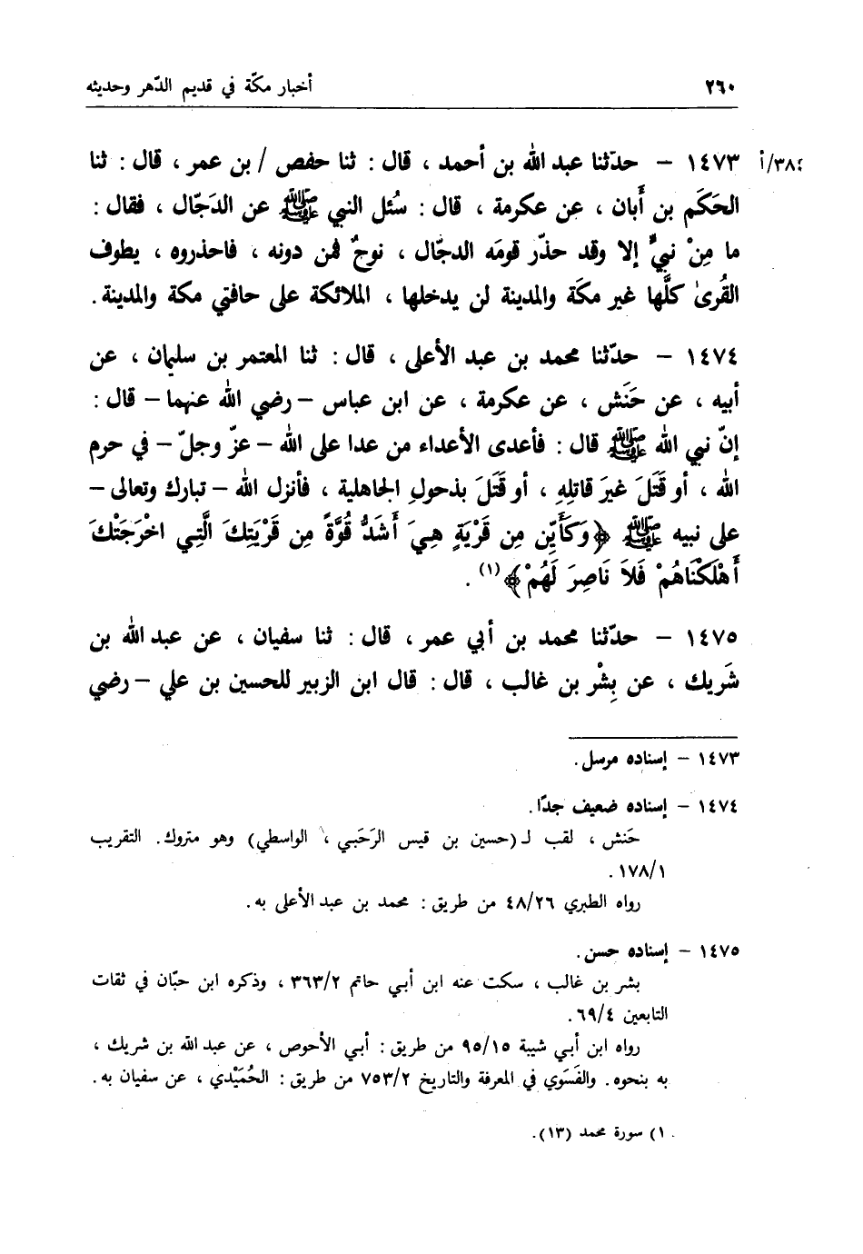 1516 - حَدَّثَنَا سَعِيدُ بْنُ عَبْدِ الرَّحْمَنِ، وَمُحَمَّدُ بْنُ أَبِي عُمَرَ، قَالَا: ثنا هِشَامُ بْنُ سُلَيْمَانَ، عَنِ ابْنِ جُرَيْجٍ قَالَ: أَخْبَرَنِي عَبْدُ اللهِ بْنُ عُثْمَانَ بْنِ خُثَيْمٍ، عَنْ مُحَمَّدِ بْنِ الْأَسْوَدِ بْنِ خَلَفٍ أَنَّهُ أَخْبَرَهُ " أَنَّ §إِبْرَاهِيمَ عَلَيْهِ الصَّلَاةُ وَالسَّلَامُ هُوَ أَوَّلُ مَنْ نَصَبَ الْأَنْصَابَ لِلْحَرَمِ، أَشَارَ لَهُ جِبْرِيلُ عَلَيْهِ السَّلَامُ إِلَى مَوَاضِعِهَا " قَالَ: وَأَخْبَرَنِي أَيْضًا أَنَّ النَّبِيَّ صَلَّى اللَّهُ عَلَيْهِ وَسَلَّمَ أَمَرَ يَوْمَ الْفَتْحِ تَمِيمَ بْنَ أَسَدٍ جَدَّ عَبْدِ الرَّحْمَنِ بْنِ الْمُطَّلِبِ بْنِ تَمِيمٍ، فَجَدَّدَهَا