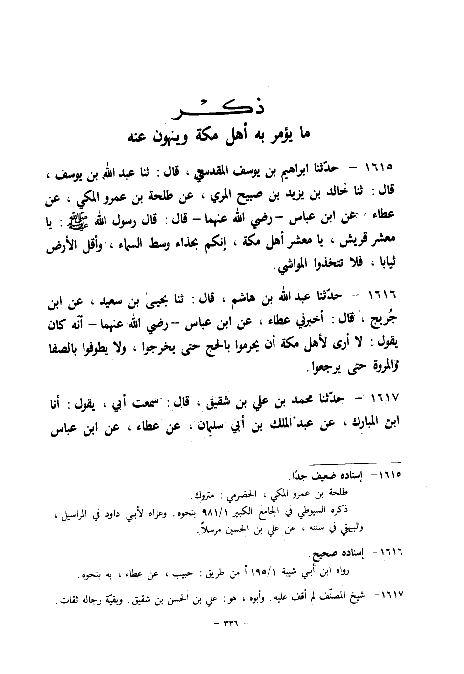1650 - حَدَّثَنَا أَبُو بِشْرٍ بَكْرُ بْنُ خَلَفٍ قَالَ: ثنا سَعِيدُ بْنُ الْحَكَمِ، عَنِ الْهُذَيْلِ بْنِ بِلَالٍ، عَنْ عَطَاءٍ قَالَ: " §لَا بَأْسَ أَنْ يَدْخُلَ مَكَّةَ بِالسِّلَاحِ "