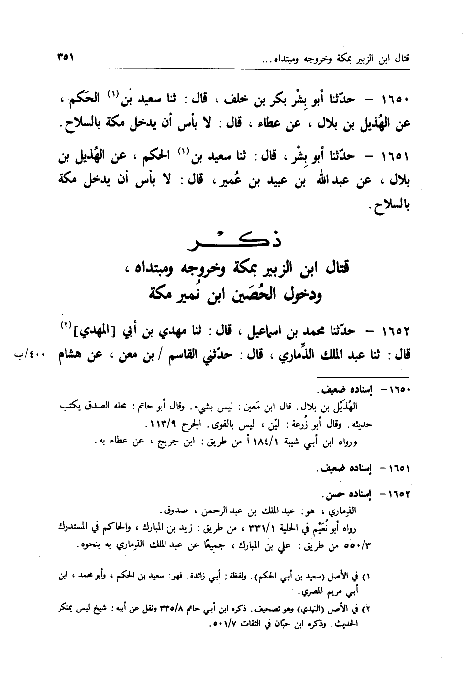 1675 - حَدَّثَنَا ابْنُ أَبِي بَزَّةَ قَالَ: حَدَّثَنِي مُحَمَّدُ بْنُ يَزِيدَ بْنِ خُنَيْسٍ -[375]- قَالَ: ثنا عَبْدُ الْعَزِيزِ بْنُ أَبِي رَوَّادٍ قَالَ: حَدَّثَنِي نَافِعٌ قَالَ: خَرَجْتُ مَعَ ابْنِ عُمَرَ رَضِيَ اللهُ عَنْهُمَا بَعْدَمَا قُتِلَ ابْنُ الزُّبَيْرِ رَضِيَ اللهُ عَنْهُمَا وَصُلِبَ عَلَى ثَنِيَّةِ الْمَدَنِيِّينَ، فَقَالَ لِي: " يَا نَافِعُ، إِذَا بَلَغْنَا الثَّنِيَّةَ فَأَتَيْنَا ابْنَ الزُّبَيْرِ فَأَخْبِرْنِي حَتَّى أُسَلِّمَ عَلَيْهِ " قَالَ نَافِعٌ: فَنَعِسْنَا بِأَصْلِ الثَّنِيَّةِ، فَمَا فَزِعْنَا إِلَّا وَبِالْحِمَارِ مِنْ تَحْتِهِ، فَفَتَحْتُ عَيْنَيَّ فَإِذَا بِهِ، فَقُلْتُ: يَا أَبَا عَبْدِ الرَّحْمَنِ، هَذَا ابْنُ الزُّبَيْرِ فَقَالَ: " سَلَامٌ عَلَيْكَ يَا أَبَا خُبَيْبٍ وَرَحْمَةُ اللهِ وَبَرَكَاتُهُ، أَمَا وَاللهِ §لَمَنْ كَبَّرَ عَلَيْكَ يَوْمَ وُلِدْتَ خَيْرٌ مِمَّنْ كَبَّرَ عَلَيْكَ يَوْمَ قُتِلْتَ، وَلَقَدْ كُنْتَ صَوَّامًا قَوَّامًا، وَلَكِنَّكَ أَنْزَلْتَ الدُّنْيَا حَيْثُ لَمْ يُنْزِلْهَا اللهُ تَعَالَى، السَّلَامُ عَلَيْكَ يَا أَبَا خُبَيْبٍ، سِرْ بِنَا يَا نَافِعُ "