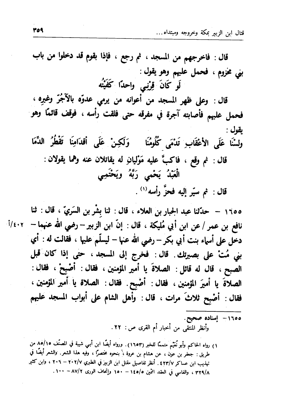 1681 - فَحَدَّثَنَا الزُّبَيْرُ بْنُ أَبِي بَكْرٍ قَالَ: حَدَّثَنِي عَبْدُ الرَّحْمَنِ بْنُ يَحْيَى الْفَرْوِيُّ قَالَ: قَالَ شَاعِرٌ مِنَ الْعَرَبِ أَسْمَاهُ فَذَهَبَ عَلَيَّ اسْمُهُ يَرْثِي الْمُنْذِرَ بْنَ الزُّبَيْرِ وَمُصْعَبَ بْنَ الزُّبَيْرِ، وَيُذَكِّرُ بِحَرِيقِ أَهْلِ الشَّامِ الْبَيْتَ: §إِنَّ الْإِمَامَ ابْنُ الزُّبَيْرِ فَإِنْ أَبَى فَذَرُوا الْخِلَافَةَ فِي بَنِي الْخَطَّابِ لَسْتُمْ لَهَا أَهْلًا وَلَسْتُمْ مِثْلَهُ فِي فَضْلِ سَابِقَةٍ وَفَضْلِ خِطَابٍ وَغَدَا النَّعِيُّ بِمُصْعَبٍ وَبِمُنْذِرٍ وَكُهُولِ صِدْقٍ سَادَةٍ وَشَبَابِ قُتِلُوا غَدَاةَ قُعَيْقِعَانَ وَحَبَّذَا قَتْلَاهُمُ قَتْلَى وَمِنْ أَسْلَابِ أَقْسَمْتُ لَوْ أَنِّي شَهِدْتُ فِرَاقَهُمْ لَاخْتَرْتُ صُحْبَتَهُمْ عَلَى الْأَصْحَابِ قَتَلُوا حَوَارِيَّ النَّبِيِّ وَحَرَّقُوا بَيْتًا بِمَكَّةَ طَاهِرَ الْأَثْوَابِ وَقَالَ: وَقُتِلَ ابْنُ الزُّبَيْرِ رَضِيَ اللهُ عَنْهُمَا يَوْمَ الثُّلَاثَاءِ لِثَلَاثَ عَشْرَةَ خَلَتْ مِنْ جُمَادَى الْآخِرَةِ سَنَةَ ثَلَاثٍ وَسَبْعِينَ، فَرَثَاهُ جَمَاعَةٌ مِنَ الْعَرَبِ بِمَرَاثِيَ كَثِيرَةٍ اخْتَصَرْنَاهَا، فَقَالَ نُعَيْمُ بْنُ مَسْعُودٍ الشَّيْبَانِيُّ يَرْثِي عَبْدَ اللهِ وَمُصْعَبًا ابْنَيِ الزُّبَيْرِ كَمَا حَدَّثَنَا ابْنُ أَبِي بَكْرٍ: -[379]- أَلَا إِنَّ هَذَا الدِّينَ مِنْ بَعْدِ مُصْعَبٍ وَبَعْدَ أَخِيهِ قَدْ تَنَكَّرَ أَجْمَعُ وَأَنْ لَيْسَ لِلدُّنْيَا بَهَاءٌ وَرِيشُهَا لَقَدْ كَانَ وَحْفًا وَافِرُ الدِّينِ أَفْرَعُ فَلِلدِّينِ وَالدُّنْيَا بَكَيْنَا وَإِنَّمَا عَلَى الدِّينِ وَالدُّنْيَا لَكَ الْخَيْرُ يَجْزَعُ عَلَى ابْنِ حَوَارِيِّ النَّبِيِّ تَحِيَّةٌ مِنَ اللهِ إِنَّ اللهَ يُعْطِي وَيَمْنَعُ فَتًى كُلَّ عَامٍ مَرَّتَيْنِ عَطَاؤُهُ وَغَيْثٌ لَنَا فِيهِ مَصِيفٌ وَمَرْبَعُ فَصُمِّمَتِ الْآذَانُ مِنْ بَعْدِ مُصْعَبٍ وَمَنْ بَعْدِ عَبْدِ اللهِ وَالْأَنْفُ أَجْدَعُ وَحَدَّثَنَا الزُّبَيْرُ بْنُ بَكَّارٍ قَالَ: قَالَ سُوَيْدُ بْنُ مَنْجُوفٍ يَرْثِيهِمَا: أَلَا قُلْ لِهَذَا الْعَاذِلِ الْمُتَغَضِّبِ تَطَاوَلَ هَذَا اللَّيْلُ مِنْ بَعْدِ مُصْعَبِ وَبَعْدَ أَخِيهِ عَائِذِ الْبَيْتِ إِنَّمَا رُمِينَا بِجَدْعٍ لِلْعَرَانِينِ مُوعِبِ فَصِرْنَا كَشَاءٍ غَابَ عَنْهَا رِعَاؤُهَا مُعَطَّلَةٍ جُنْحَ الظَّلَامِ لِأَذْؤُبِ فَإِنْ يَكُ هَذَا الدَّهْرُ أَنْحَى بِنَابِهِ وَأَنْحَى عَلَيْنَا بَعْدَ نَابٍ بِمِخْلَبِ وَأَصْبَحَ أَهْلُ الشَّامِ يَرْمُونَ مِصْرَنَا بِنَبْلٍ بَرَوْهَا لِلْعَدَاوَةِ صُيَّبِ فَإِنِّي لَبَاكٍ مَا حَيِيتُ عَلَيْهِمَا وَمُثْنٍ ثَنَاءً لَيْسَ فِيهِ تَعَتُّبُ أَرَى الدِّينَ وَالدُّنْيَا جَمِيعًا كَأَنَّمَا هَوَتْ بِهِمَا بِالْأَمْسِ عَنْقَاءُ مُغْرِبِ هُمَا مَا هُمَا كَانَا لِذَا الدِّينِ عِصْمَةً فَهَلْ بَعْدَ هَذَا مِنْ بَقَاءٍ لِمَطْلَبِ فَزَادَهُمَا مِنِّي صَلَاةً وَرَحْمَةً وَحَرَّةَ ثُكْلٍ دَائِمٍ بِتَنَحُّبِ فَقَدْ دَخَلَ الْمِصْرَيْنِ خِزْيٌ وَذِلَّةٌ وَجَدْعٌ لِأَهْلِ الْمَكَّتَيْنِ وَيَثْرِبٍ وَبُدِّلْتُ مِمَّنْ كُنْتُ أَهْوَى لِقَاءَهُ مَعَاشِرَ حَيٍّ ذِي كَلَاعٍ وَيَحْصُبِ وَعَكًّا وَلَخْمًا وَالسُّكُونَ وَفِرْقَةً بَرَابِرَةَ الْأَخْلَاطِ أَخْلَاطِ سَقْلَبِ