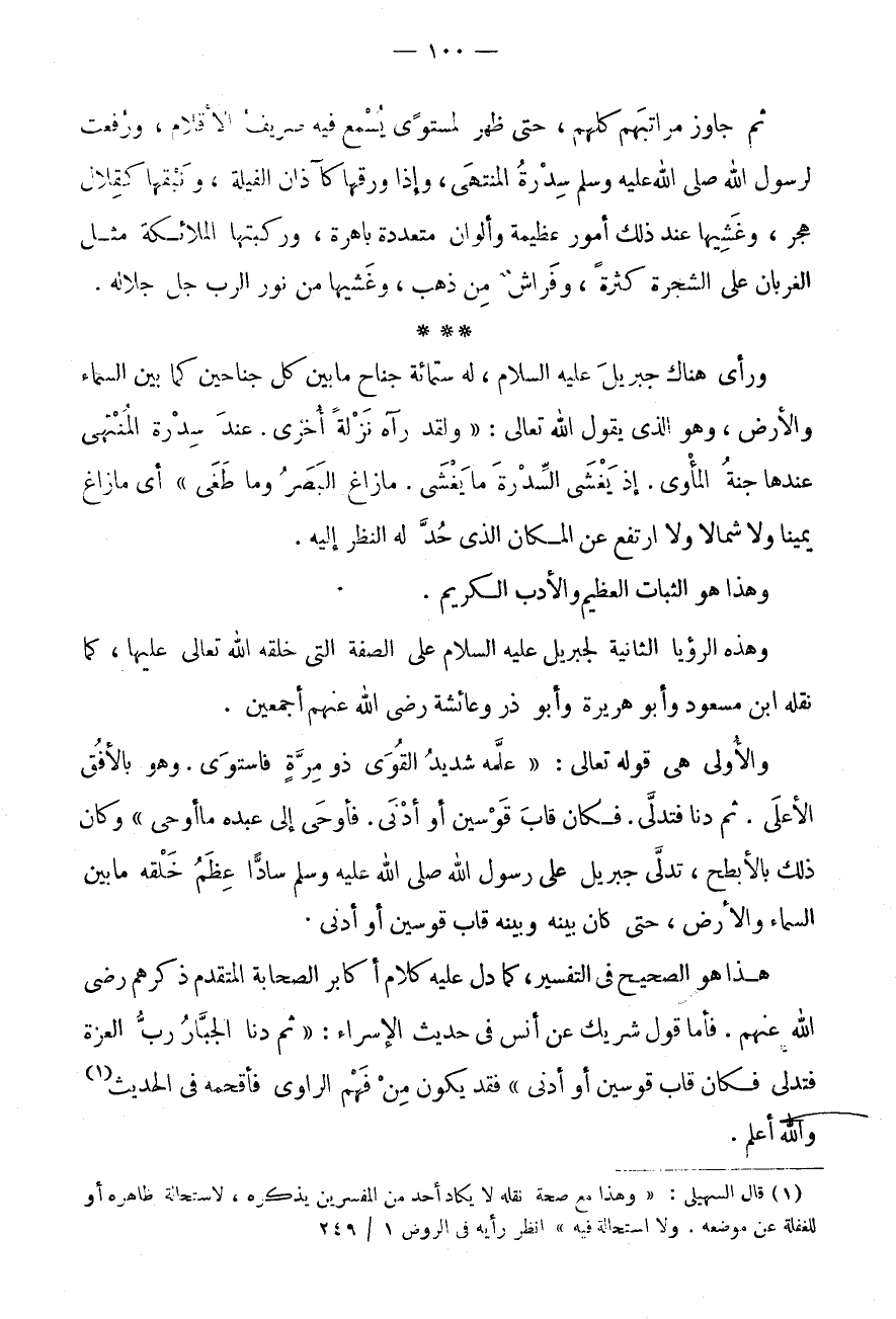 * * * وَرَأَى هُنَاكَ جِبْرِيلَ عَلَيْهِ السَّلَامُ، لَهُ سِتُّمِائَةِ جَنَاحٍ مَا بَيْنَ كُلِّ جَنَاحَيْنِ كَمَا بَيْنَ السَّمَاءِ وَالْأَرْضِ، وَهُوَ الَّذِي يَقُولُ اللَّهُ تَعَالَى: " وَلَقَدْ رَآهُ نَزْلَةً أُخْرَى.