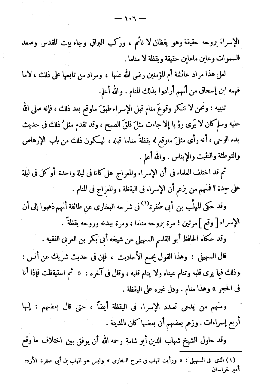 وَقَدْ حَكَى الْمُهَلَّبُ بْنُ أَبِي صُفْرَةَ (1) فِي شَرْحِهِ الْبُخَارِيَّ عَنْ طَائِفَة أَنهم ذَهَبُوا إِلَى أَن الاسراء [وَقع] مرَّتَيْنِ، مَرَّةٌ بِرُوحِهِ مَنَامًا، وَمَرَّةٌ بِبَدَنِهِ وَرُوحِهِ يَقَظَةً.