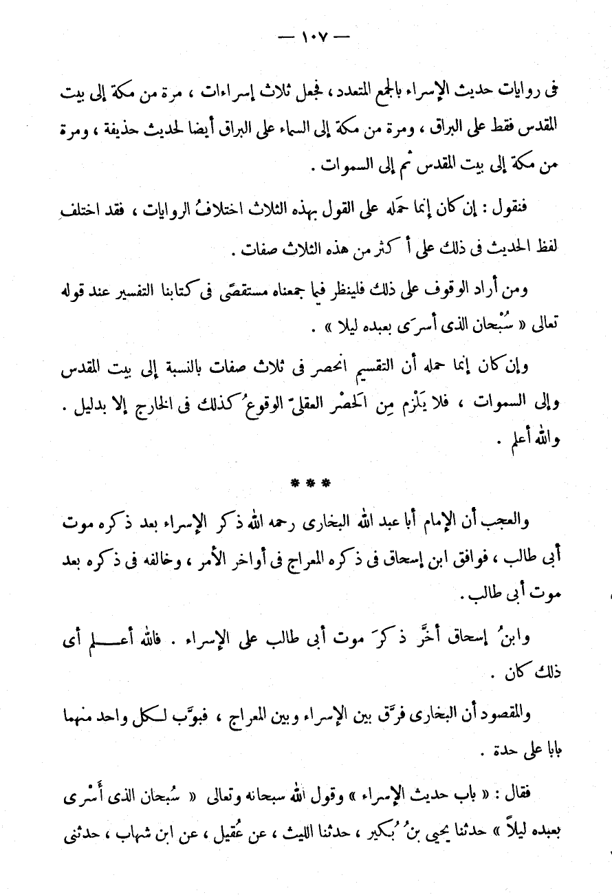 * * * وَالْعَجَبُ أَنَّ الْإِمَامَ أَبَا عَبْدِ اللَّهِ الْبُخَارِيَّ رَحِمَهُ اللَّهُ ذَكَرَ الْإِسْرَاءَ بَعْدَ ذِكْرِهِ مَوْتَ أَبِي طَالِبٍ، فَوَافَقَ ابْنَ إِسْحَاقَ فِي ذِكْرِهِ الْمِعْرَاجَ فِي أَوَاخِرِ الْأَمْرِ، وَخَالَفَهُ فِي ذِكْرِهِ بَعْدَ مَوْتِ أَبِي طَالِبٍ.