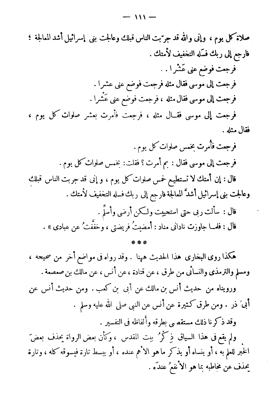 فَرَجَعْتُ إِلَى مُوسَى فَقَالَ: بِمَ أمرت؟ فَقلت: بِخَمْسِ صَلَوَاتٍ كُلَّ يَوْمٍ.