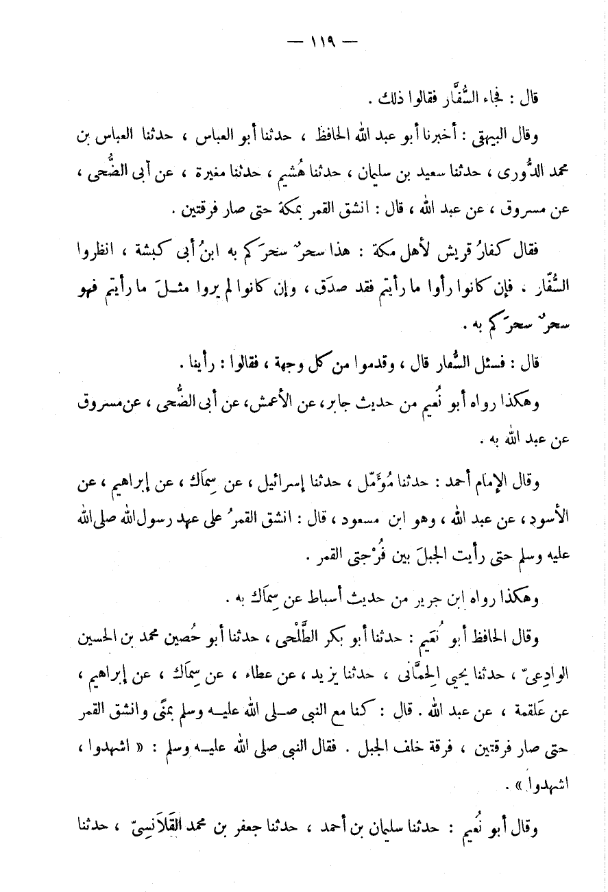 وَقَالَ الْبَيْهَقِيُّ: أَخْبَرَنَا أَبُو عَبْدِ اللَّهِ الْحَافِظُ، حَدَّثَنَا أَبُو الْعَبَّاسِ، حَدَّثَنَا الْعَبَّاسُ بْنُ مُحَمَّدٍ الدُّورِيُّ، حَدَّثَنَا سَعِيدُ بْنُ سُلَيْمَانَ، حَدَّثَنَا هُشَيْمٌ، حَدَّثَنَا مُغِيرَةُ، عَنْ أَبِي الضُّحَى، عَنْ مَسْرُوقٍ، عَنْ عَبْدِ اللَّهِ، قَالَ: انْشَقَّ الْقَمَرُ بِمَكَّةَ حَتَّى صَارَ فِرْقَتَيْنِ.