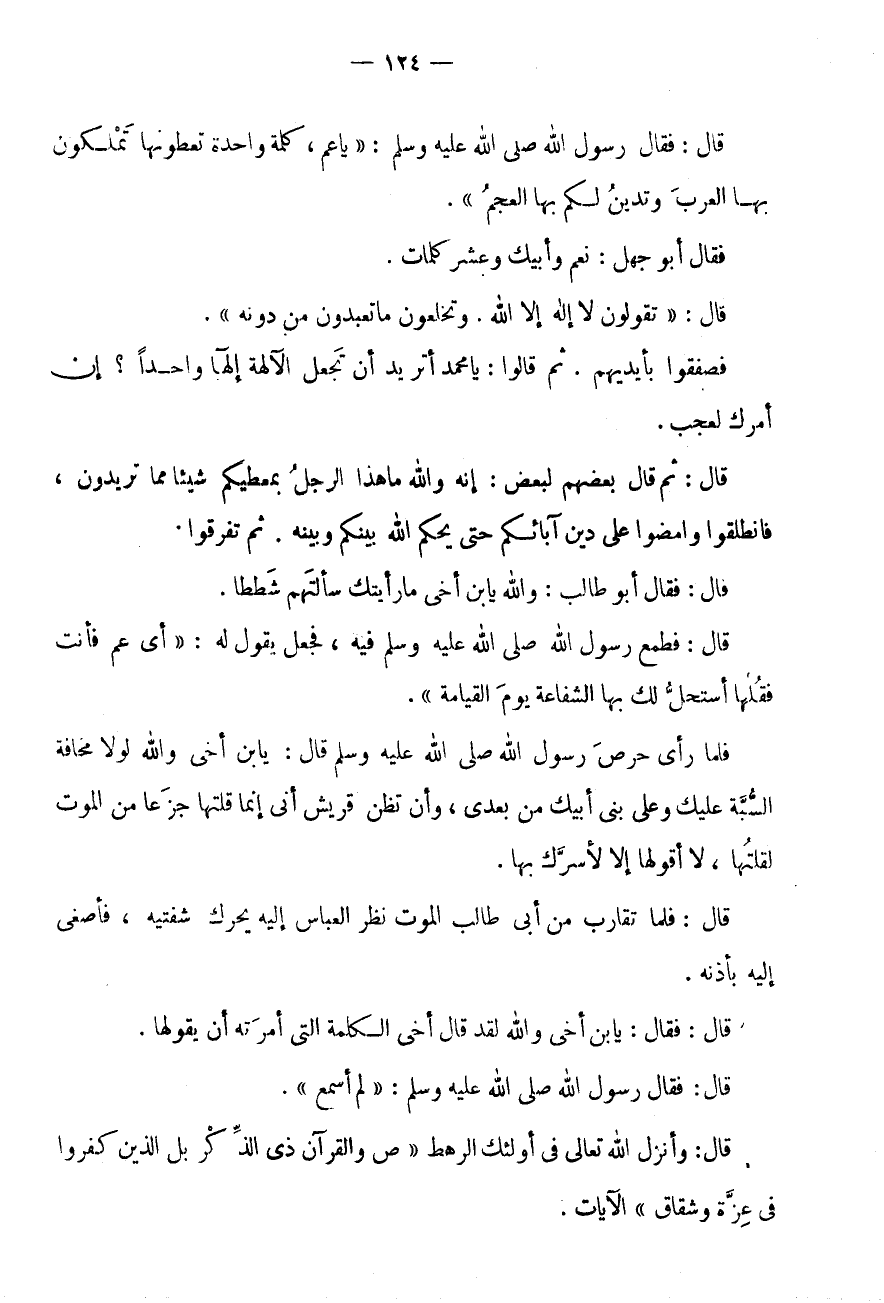 فَلَمَّا رَأَى حِرْصَ رَسُولِ اللَّهِ صَلَّى اللَّهُ عَلَيْهِ وَسَلَّمَ قَالَ: يَا بن أَخِي وَاللَّهِ لَوْلَا مَخَافَةُ السُّبَّةِ عَلَيْكَ وَعَلَى بَنِي أَبِيكَ مِنْ بَعْدِي، وَأَنْ تَظُنَّ قُرَيْشٌ أَنِّي إِنَّمَا قُلْتُهَا جَزَعًا مِنَ الْمَوْتِ لَقُلْتُهَا، لَا أَقُولُهَا إِلَّا لِأَسُرَّكَ بِهَا.