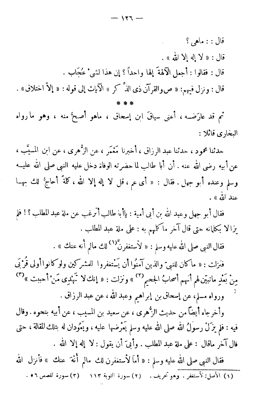 * * * ثُمَّ قَدْ عَارَضَهُ، أَعْنِي سِيَاقَ ابْنِ إِسْحَاقَ، مَا هُوَ أَصَحُّ مِنْهُ، وَهُوَ مَا رَوَاهُ البُخَارِيّ قَائِلًا: حَدَّثَنَا مَحْمُودٌ، حَدَّثَنَا عَبْدُ الرَّزَّاقِ، أَخْبَرَنَا مَعْمَرٌ، عَنِ الزُّهْرِيِّ، عَنِ ابْنِ الْمُسَيِّبِ، عَنْ أَبِيهِ رَضِيَ اللَّهُ عَنْهُ.