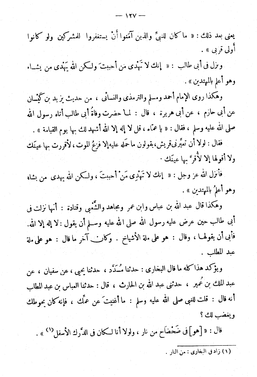 هَكَذَا روى الامام أَحْمد وَمُسلم وَالتِّرْمِذِيّ وَالنَّسَائِيّ، مِنْ حَدِيثِ يَزِيدَ بْنِ كَيْسَانَ عَنْ أَبِي حَازِمٍ، عَنْ أَبِي هُرَيْرَةَ، قَالَ: لَمَّا حَضَرَتْ وَفَاةُ أَبِي طَالِبٍ أَتَاهُ رَسُولُ اللَّهِ صَلَّى اللَّهُ عَلَيْهِ وَسَلَّمَ، فَقَالَ: " يَا عَمَّاهُ، قُلْ لَا إِلَهَ إِلَّا اللَّهُ أَشْهَدُ لَكَ بِهَا يَوْمَ الْقِيَامَةِ ".