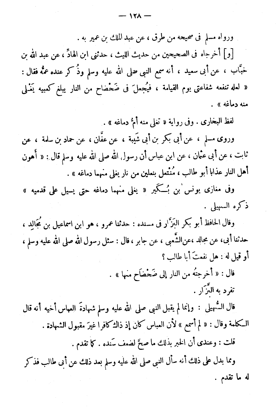 وَرَوَى مُسْلِمٌ، عَنْ أَبِي بَكْرِ بْنِ أَبِي شَيْبَةَ، عَنْ عَفَّانَ، عَنْ حَمَّادُ بْنُ سَلَمَةَ، عَنْ ثَابِتٍ، عَنْ أَبِي عُثْمَانَ، عَنِ ابْنِ عَبَّاسٍ أَنَّ رَسُولَ اللَّهِ صَلَّى اللَّهُ عَلَيْهِ وَسَلَّمَ قَالَ: " أَهْوَنُ أَهْلِ النَّارِ عَذَابًا أَبُو طَالب، منتعل بنعلين من النَّار يَغْلِي مِنْهُمَا دِمَاغُهُ ".
