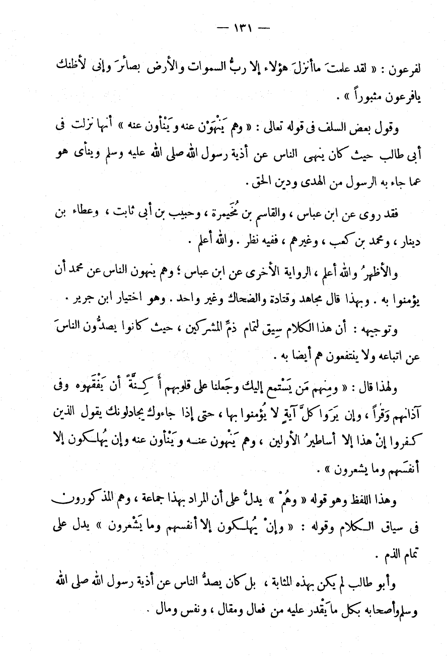 وَقَوْلُ بَعْضِ السَّلَفِ فِي قَوْلِهِ تَعَالَى: " وَهُمْ ينهون عَنهُ وينأون عَنهُ " إِنَّهَا نَزَلَتْ فِي أَبِي طَالِبٍ حَيْثُ كَانَ يَنْهَى النَّاسَ عَنْ أَذِيَّةِ رَسُولِ اللَّهِ صَلَّى اللَّهُ عَلَيْهِ وَسَلَّمَ وَيَنْأَى هُوَ عَمَّا جَاءَ بِهِ الرَّسُولُ مِنَ الْهُدَى وَدِينِ الْحَقِّ.