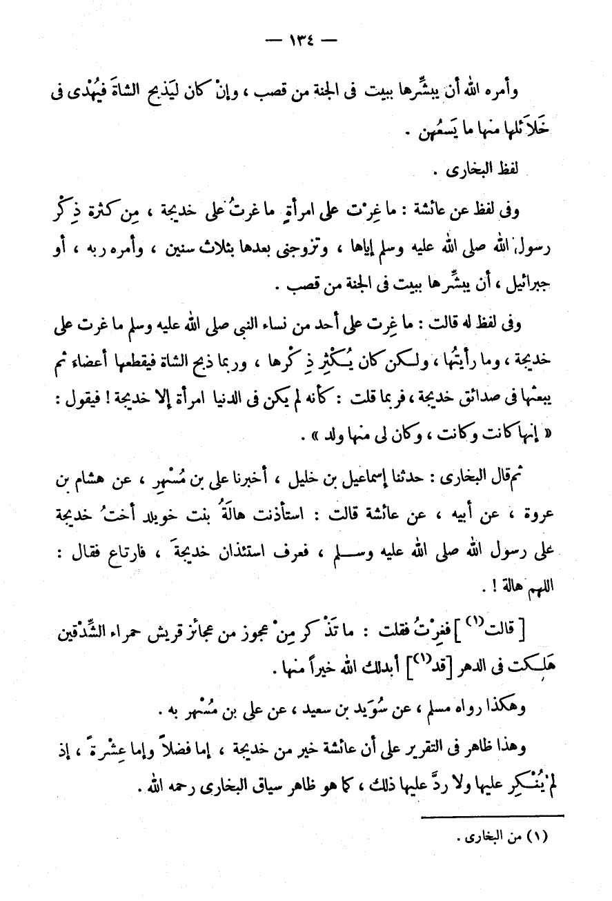 وَأمره الله أَنْ يُبَشِّرَهَا بِبَيْتٍ فِي الْجَنَّةِ مِنْ قَصَبٍ، وَإِنْ كَانَ لَيَذْبَحُ الشَّاةَ فَيُهْدِي فِي خَلَائِلِهَا مِنْهَا مَا يَسَعُهُنَّ.