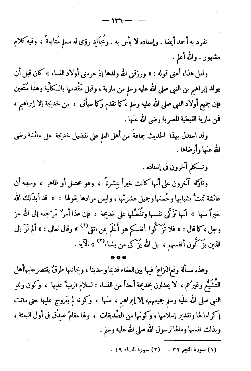 * * * وَهَذِهِ مَسْأَلَةٌ وَقَعَ النِّزَاعُ فِيهَا بَيْنَ الْعلمَاء قَدِيما وحديثا، وبجانبها طرق يقْتَصر عَلَيْهَا أَهِلُ التَّشَيُّعِ وَغَيْرُهُمْ، لَا يَعْدِلُونَ بِخَدِيجَةَ أَحَدًا مِنَ النِّسَاءِ: لِسَلَامِ الرَّبِّ عَلَيْهَا، وَكَوْنِ وَلَدِ النَّبِيِّ صَلَّى اللَّهُ عَلَيْهِ وَسَلَّمَ جَمِيعِهِمْ، إِلَّا إِبْرَاهِيمَ، مِنْهَا، وَكَوْنِهِ لَمْ يَتَزَوَّجْ عَلَيْهَا حَتَّى مَاتَت إِكْرَاما لَهَا وَتَقْدِير إِسْلَامِهَا، وَكَوْنِهَا مِنَ الصِّدِّيقَاتِ، وَلَهَا مَقَامُ صِدْقٍ فِي أَوَّلِ الْبِعْثَةِ، وَبَذَلَتْ نَفْسَهَا وَمَالَهَا لِرَسُولِ الله صلى الله عَلَيْهِ وَسلم.
