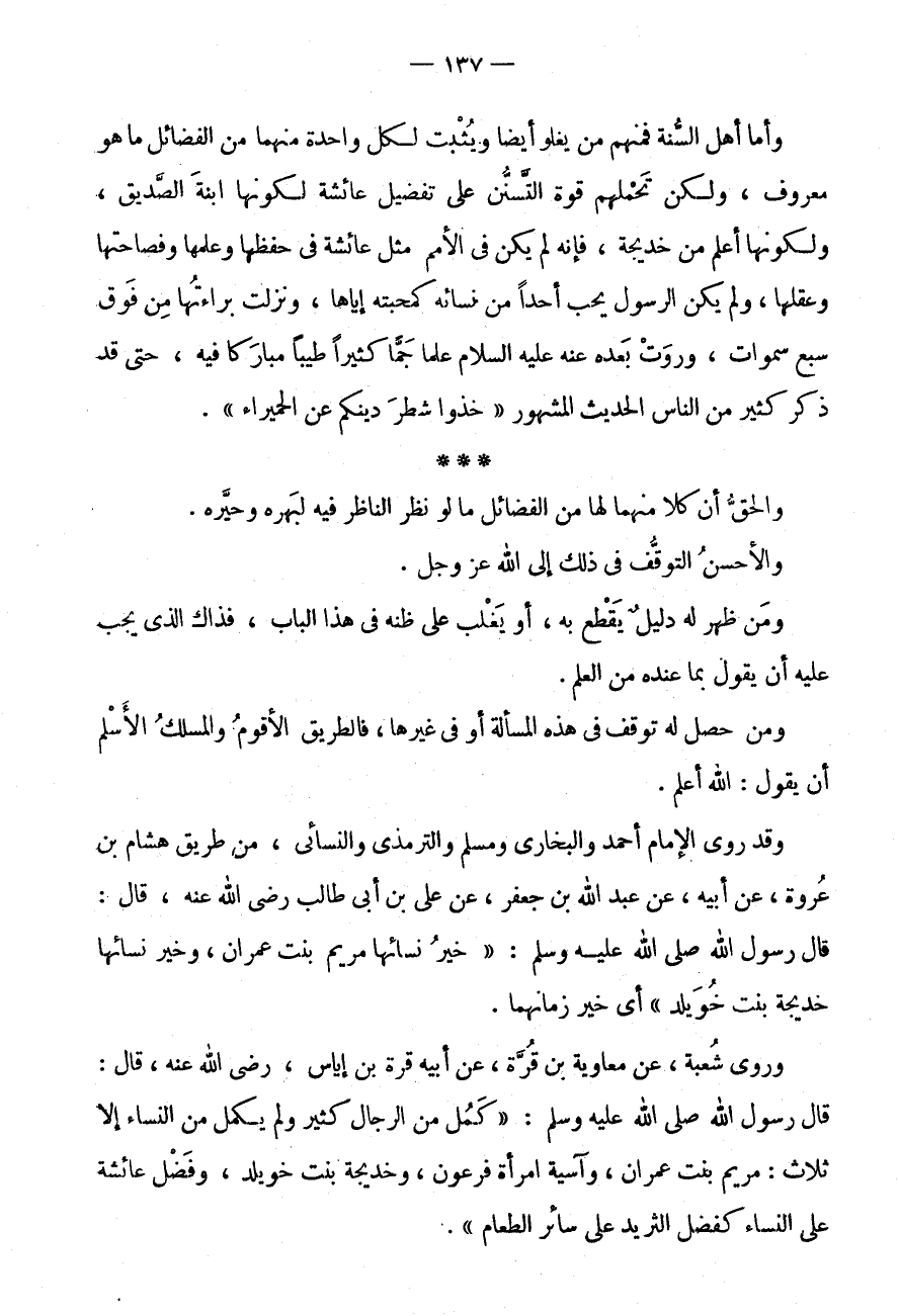 * * * الْحق أَنَّ كُلًّا مِنْهُمَا لَهَا مِنَ الْفَضَائِلِ مَا لَوْ نَظَرَ النَّاظِرُ فِيهِ لَبَهَرَهُ وَحَيَّرَهُ.