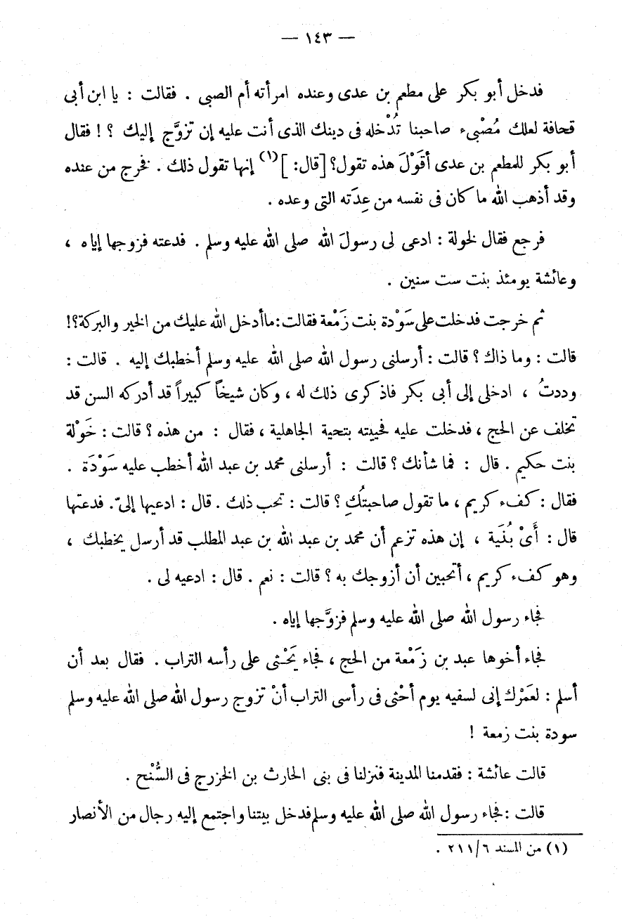 فَقَالَ بَعْدَ أَنْ أَسْلَمَ: لَعَمْرُكَ إِنِّي لَسَفِيهٌ يَوْمَ أَحْثِي فِي رَأْسِي التُّرَابَ أَنْ تَزَوَّجَ رَسُولُ اللَّهِ صَلَّى اللَّهُ عَلَيْهِ وَسَلَّمَ سَوْدَةَ بِنْتَ زَمْعَةَ! قَالَتْ عَائِشَةُ: فَقَدِمْنَا الْمَدِينَةَ فَنَزَلْنَا فِي بَنِي الْحَارِثِ بْنِ الْخَزْرَجِ فِي السُّنْحِ.