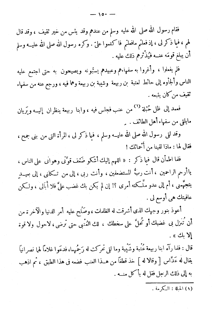 فَعَمَدَ إِلَى ظِلِّ حَبَلَةٍ (1) مِنْ عِنَبٍ فَجَلَسَ فِيهِ، وَابْنَا رَبِيعَةَ يَنْظُرَانِ إِلَيْهِ وَيَرَيَانِ مَا يَلْقَى مِنْ سُفَهَاءِ أَهْلِ الطَّائِفِ.