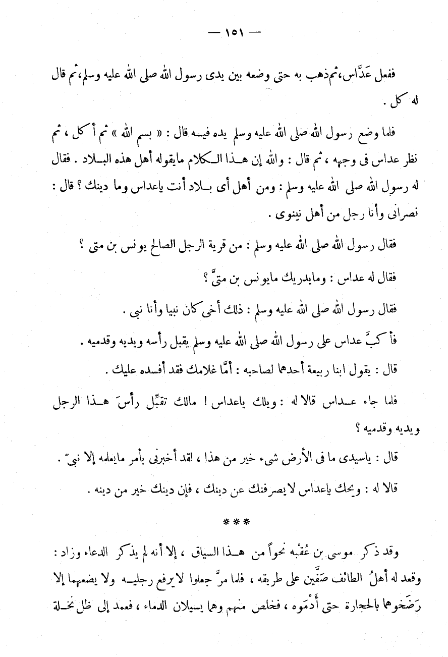 فَقَالَ رَسُولُ اللَّهِ صَلَّى اللَّهُ عَلَيْهِ وَسَلَّمَ: مِنْ قَرْيَةِ الرَّجُلِ الصَّالِحِ يُونُسَ بْنِ مَتَّى؟ فَقَالَ لَهُ عَدَّاسٌ: وَمَا يُدْرِيكَ مَا يُونُسُ بْنُ مَتَّى؟ فَقَالَ رَسُولُ اللَّهِ صَلَّى اللَّهُ عَلَيْهِ وَسَلَّمَ: وَذَلِكَ أَخِي كَانَ نَبِيًّا وَأَنَا نَبِيٌّ.