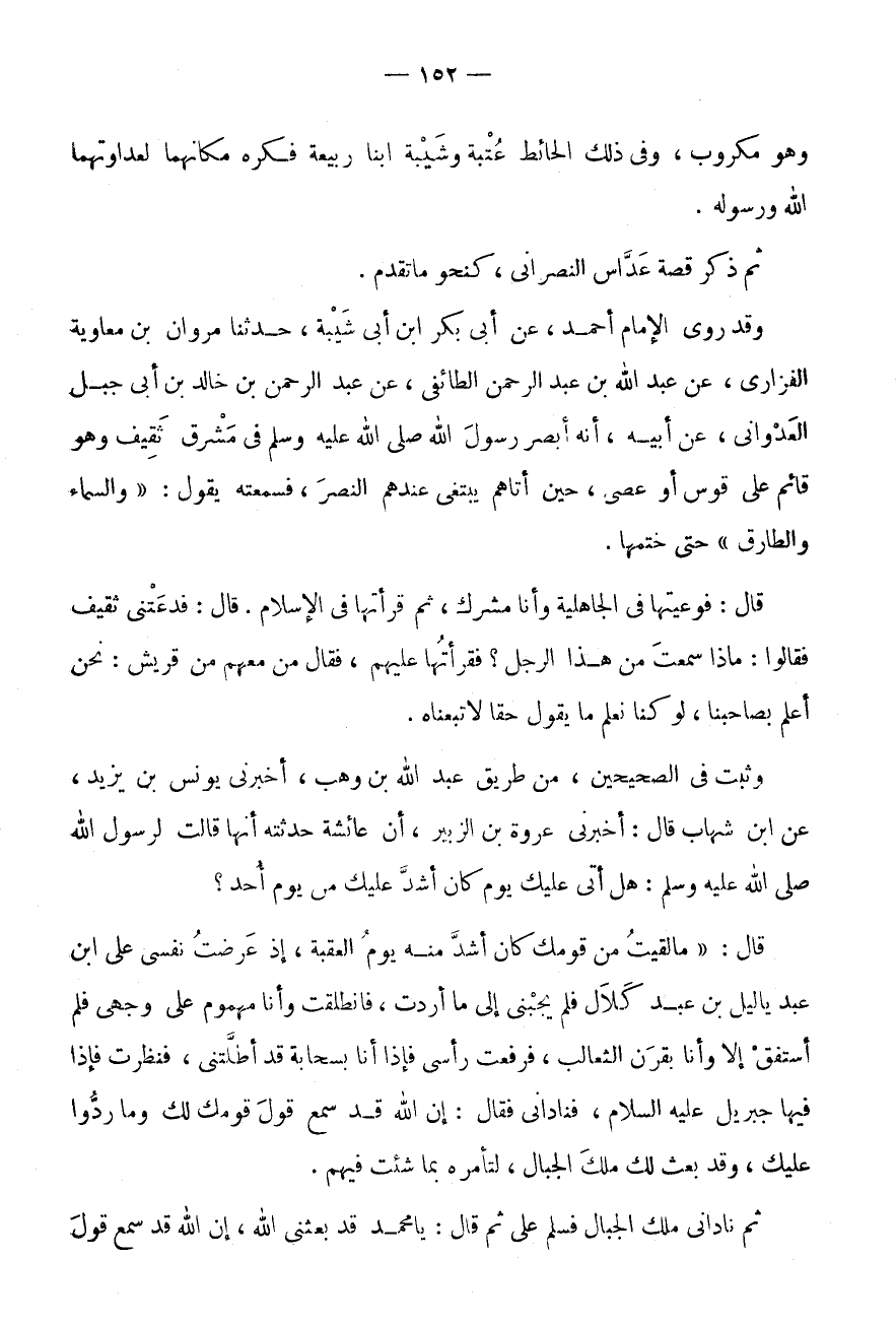 وَثَبَتَ فِي الصَّحِيحَيْنِ، مِنْ طَرِيقِ عَبْدِ اللَّهِ بْنِ وَهْبٍ، أَخْبَرَنِي يُونُسُ بْنُ يَزِيدَ، عَنِ ابْنِ شِهَابٍ قَالَ: أَخْبَرَنِي عُرْوَةُ بْنُ الزُّبَيْرِ، أَنَّ عَائِشَةَ حَدَّثَتْهُ أَنَّهَا قَالَتْ لِرَسُولِ اللَّهِ صَلَّى اللَّهُ عَلَيْهِ وَسَلَّمَ: هَلْ أَتَى عَلَيْكَ يَوْم كَانَ أَشد عَلَيْك من يَوْم أحد؟ قَالَ: " مَا لقِيت من قَوْمك كَانَ أَشد مِنْهُ يَوْمَ الْعَقَبَةِ، إِذْ عَرَضْتُ نَفْسِي عَلَى ابْنِ عَبْدِ يَالِيلَ بْنِ عَبْدِ كُلَالٍ فَلَمْ يُجِبْنِي إِلَى مَا أَرَدْتُ، فَانْطَلَقْتُ وَأَنَا مَهْمُومٌ عَلَى وَجْهِي فَلَمْ أَسْتَفِقْ إِلَّا وَأَنَا بِقَرْنِ الثَّعَالِبِ، فَرفعت رَأْسِي فَإِذا أَنا بسحابة قد أطلتني، فَنَظَرْتُ فَإِذَا فِيهَا جِبْرِيلُ عَلَيْهِ السَّلَامُ، فَنَادَانِي فَقَالَ: إِنَّ اللَّهَ قَدْ سَمِعَ قَوْلَ قَوْمِكَ لَكَ وَمَا رَدُّوا عَلَيْكَ، وَقَدْ بَعَثَ لَكَ مَلَكَ الْجِبَالِ، لِتَأْمُرَهُ بِمَا شِئْتَ فِيهِمْ.