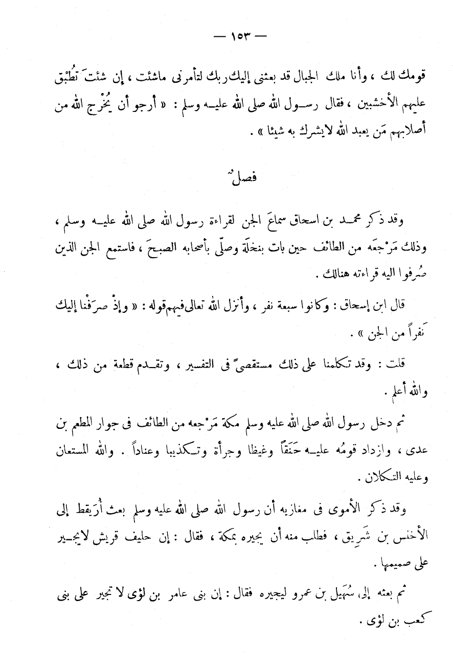 فَصْلٌ وَقَدْ ذَكَرَ مُحَمَّدُ بْنُ إِسْحَاقَ سَمَاعَ الْجِنِّ لِقِرَاءَةِ رَسُولِ اللَّهِ صَلَّى اللَّهُ عَلَيْهِ وَسَلَّمَ، وَذَلِكَ مَرْجِعَهُ مِنَ الطَّائِفِ حِينَ بَاتَ بِنَخْلَةَ وَصَلَّى بِأَصْحَابِهِ الصُّبْحَ، فَاسْتَمَعَ الْجِنُّ الَّذِينَ صُرِفُوا إِلَيْهِ قِرَاءَتَهُ هُنَالِكَ.